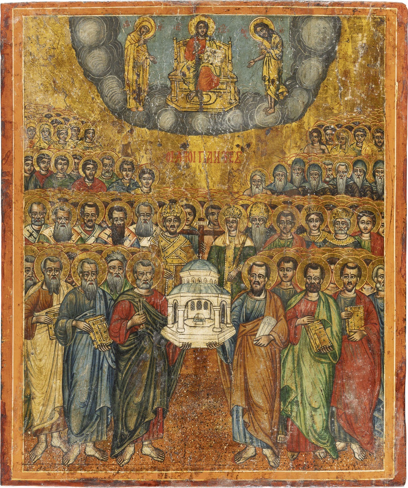 A LARGE ICON 'ALL SAINTS' Greek, 19th century Tempera on wood panel. The Orthodox saints portrayed according to their ranking in registers. Painted with saturated colours and gold. The edges minimally restored. On the reverse, Turkish export permit. 42.4 x 35.7 cm.