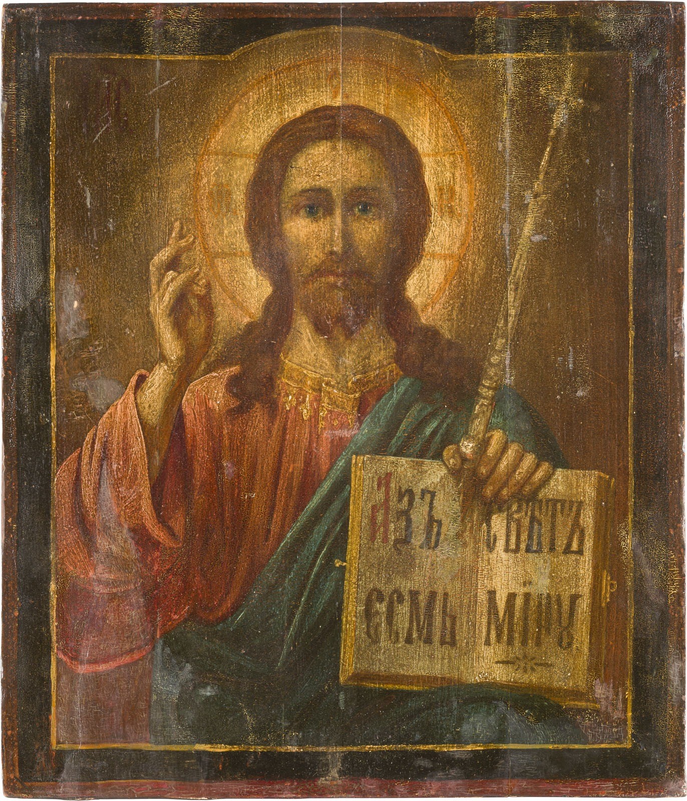 A LARGE ICON SHOWING CHRIST PANTOKRATOR Russian, circa 1900 Oil on wood panel. Vertical cracks partially restored. 39.4 x 34 cm.