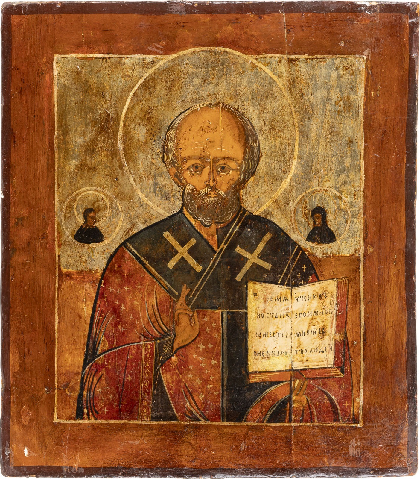 A LARGE ICON SHOWING ST. NICHOLAS OF MYRA Russian, 19th century Tempera on wood panel. The background made of silver, covered by a golden lacquer. Partially restored. 40.4 x 35.5 cm.