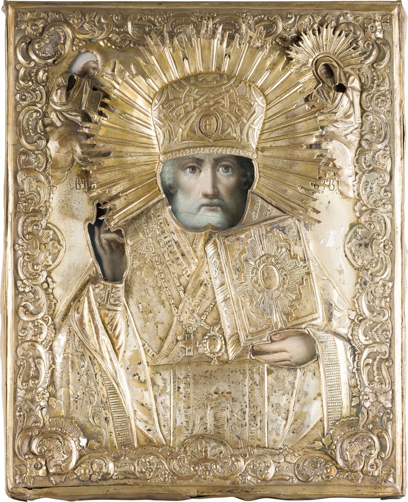 A LARGE ICON SHOWING ST. NICHOLAS OF MYRA WITH OKLAD Russian, mid 19th century Oil on wood panel with velvet backing. The brass oklad chased and repoussé with rocailles motifs. Minor damages to the edges. 38 x 31 cm.
