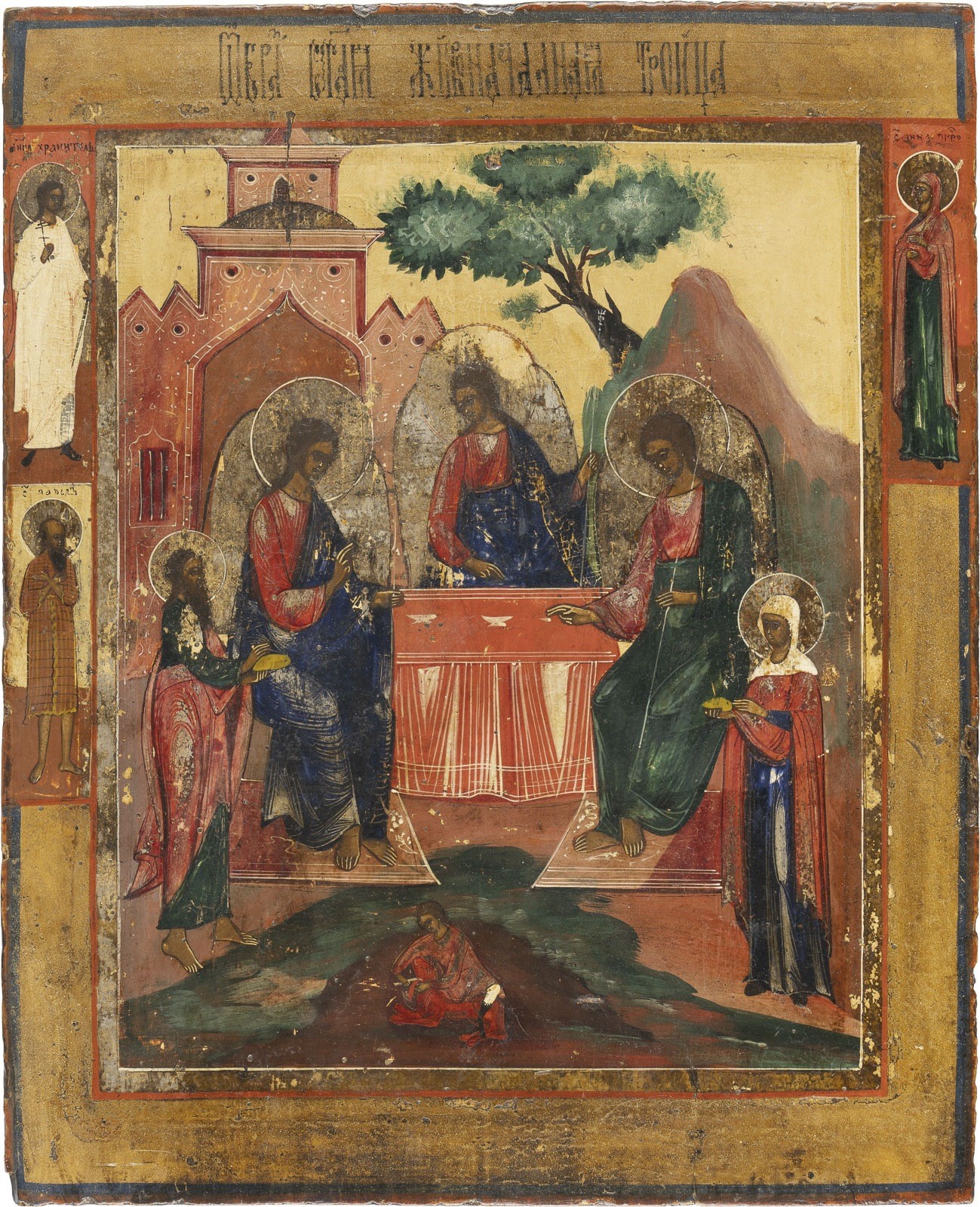 A LARGE ICON SHOWING THE OLD TESTAMENT TRINITY Russian, circa 1800 Tempera on wood panel. The haloes made of silver, covered by a golden lacquer. Three selected saints on the borders, among them the Guardian Angel. Partially worn, the edges partially chipped. 42.8 x 35.2 cm.