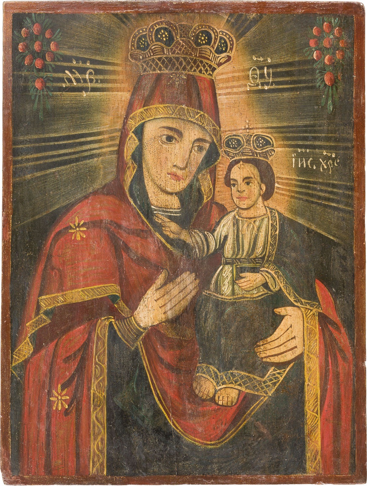 A LARGE ICON SHOWING THE QUICK TO HEAR MOTHER OF GOD (SKOROPOSLUSHNITSA) Ukrainian, 19th century Oil on wood panel. Partially restored. 39.7 x 30 cm.