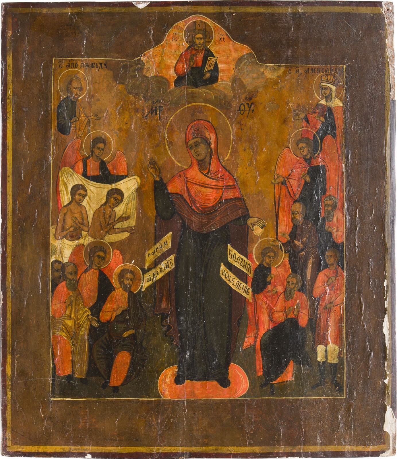 A LARGE ICON SHOWING THE MOTHER OF GOD 'JOY TO ALL WHO GRIEVE' Russian, 19th century Tempera on wood panel. Losses, restorations. 40 x 34.7 cm.