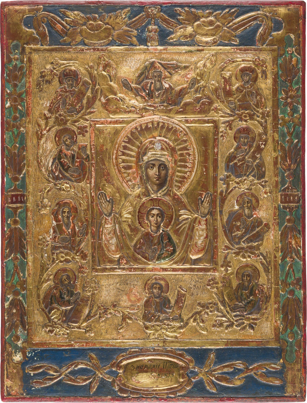 A LARGE ICON SHOWING THE MOTHER OF GOD ZNAMENIE OF KURSK Russian, 2nd half of the 18th century A wood panel, carved in relief, oil, gilded background. Minimally worn. 42.5 x 32.5 cm.