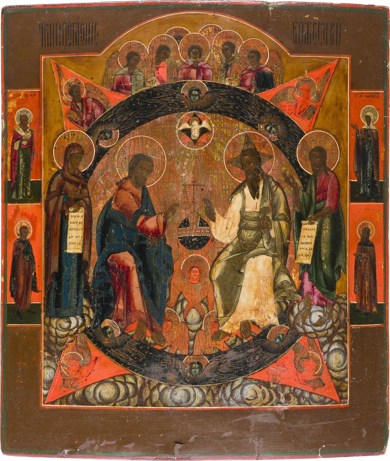 A LARGE ICON SHOWING THE NEW TESTAMENT TRINITY Russian, 19th century Tempera on wood panel. The haloes and background made of gold. Four selected saints on the borders. Paint blisterings, partially restored. 43.7 x 39 cm.