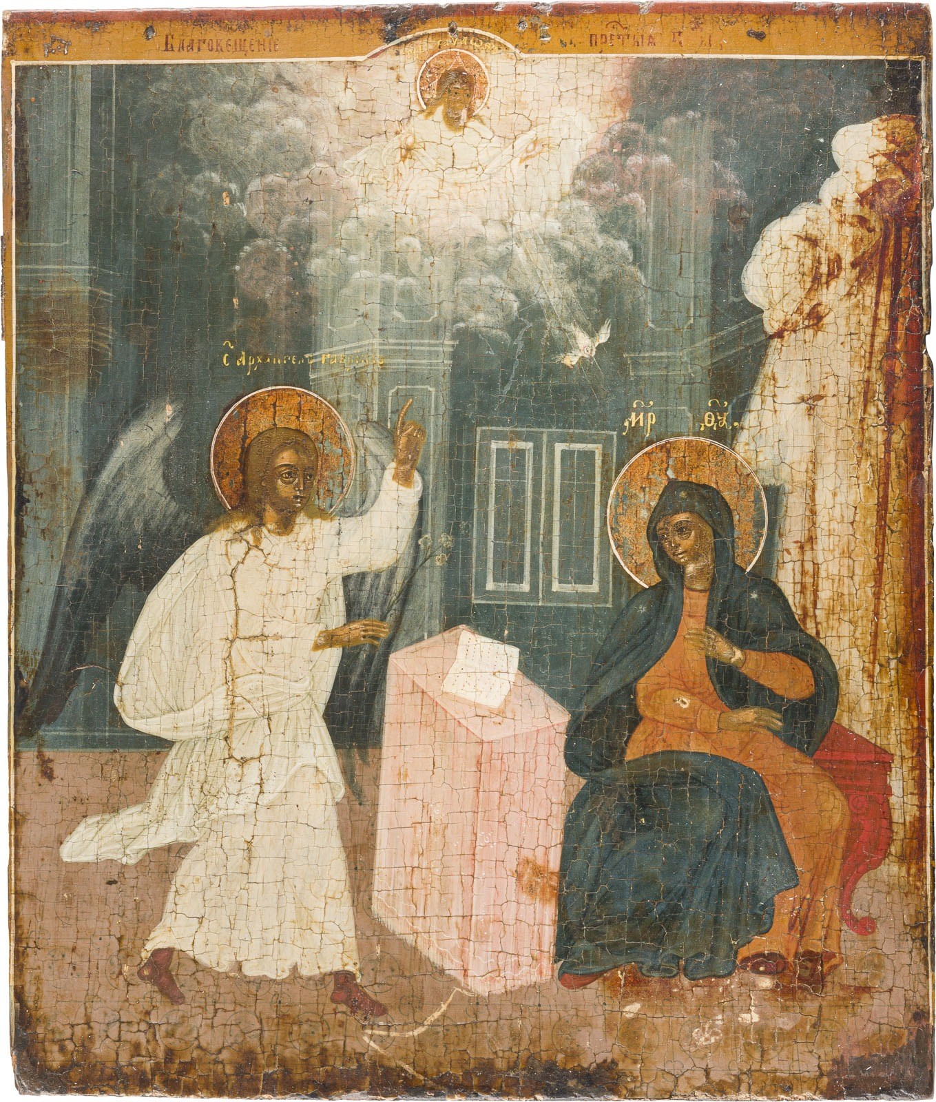 A LARGE ICON SHOWING THE ANNUNCIATION Russian, 18th century Tempera on wood panel. The haloes made of gold. The edges partially cut. 36 x 30.9 cm.