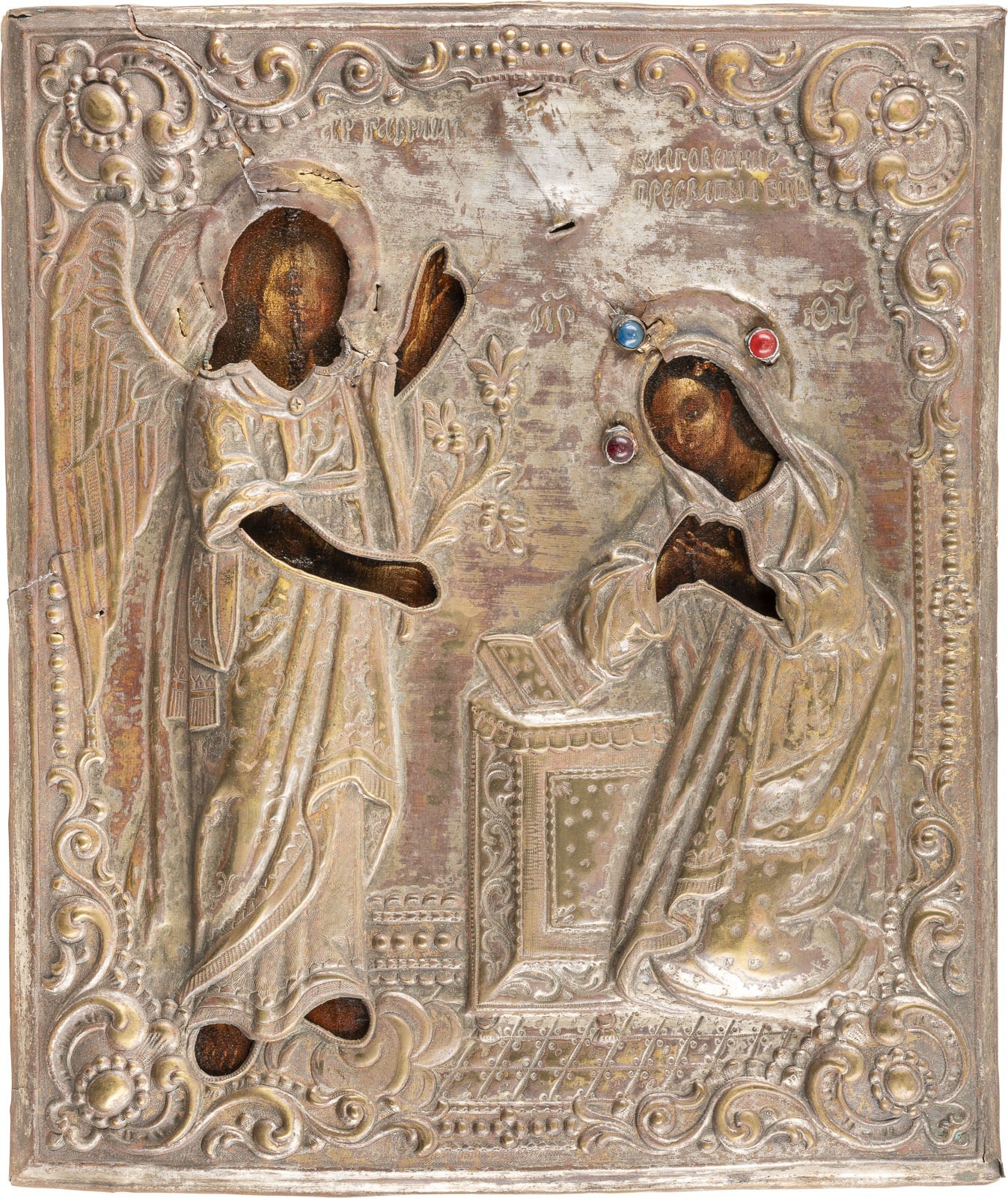 A LARGE ICON SHOWING THE ANNUNCIATION OF THE MOTHER OF GOD WITH OKLAD Russian, circa 1850 Oil on wood panel. Overlaid with a chased brass oklad. Minor losses, damages to the oklad. 39.5 x 33.6 cm.