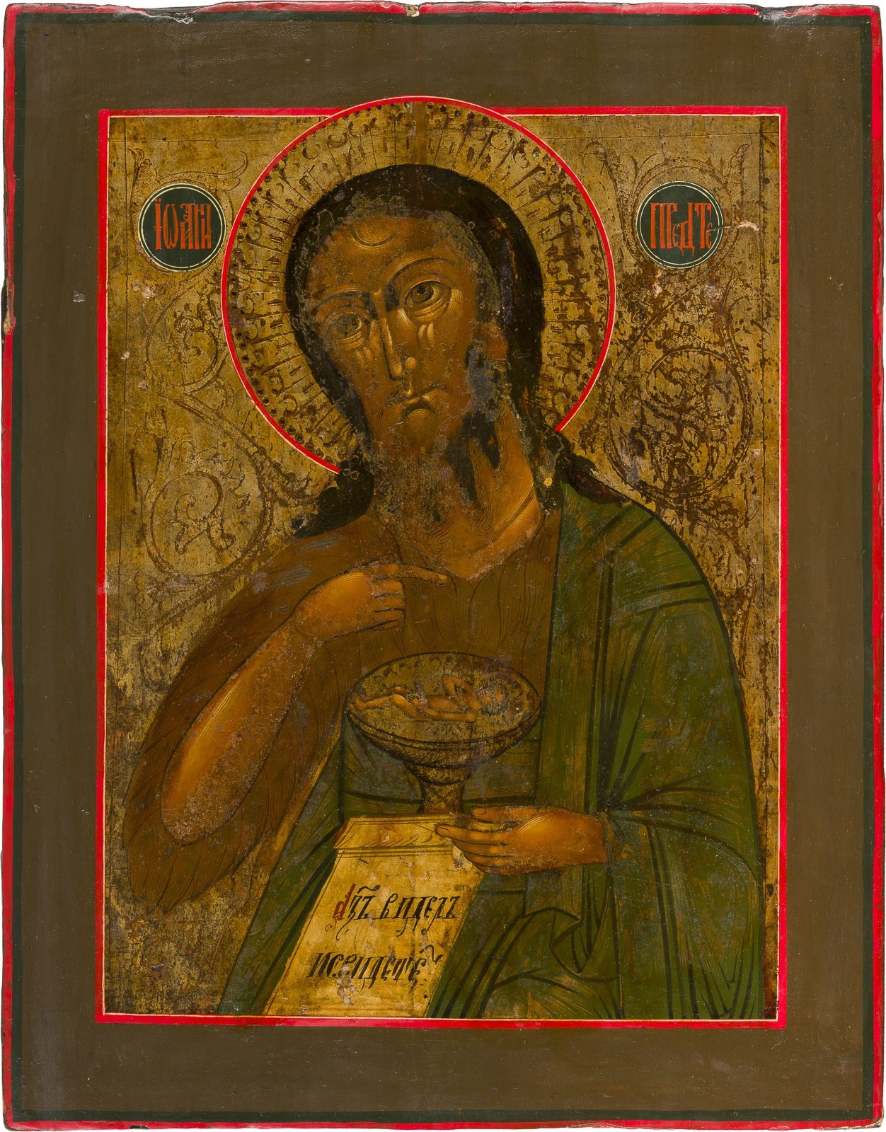 A LARGE ICON SHOWING ST. JOHN THE FORERUNNER FROM A DEISIS Russian, 19th century Tempera on wood panel. The background made of silver, covered by a golden lacquer. The background etched with scrolling foliage. Restorations. 45.1 x 35.2 cm.