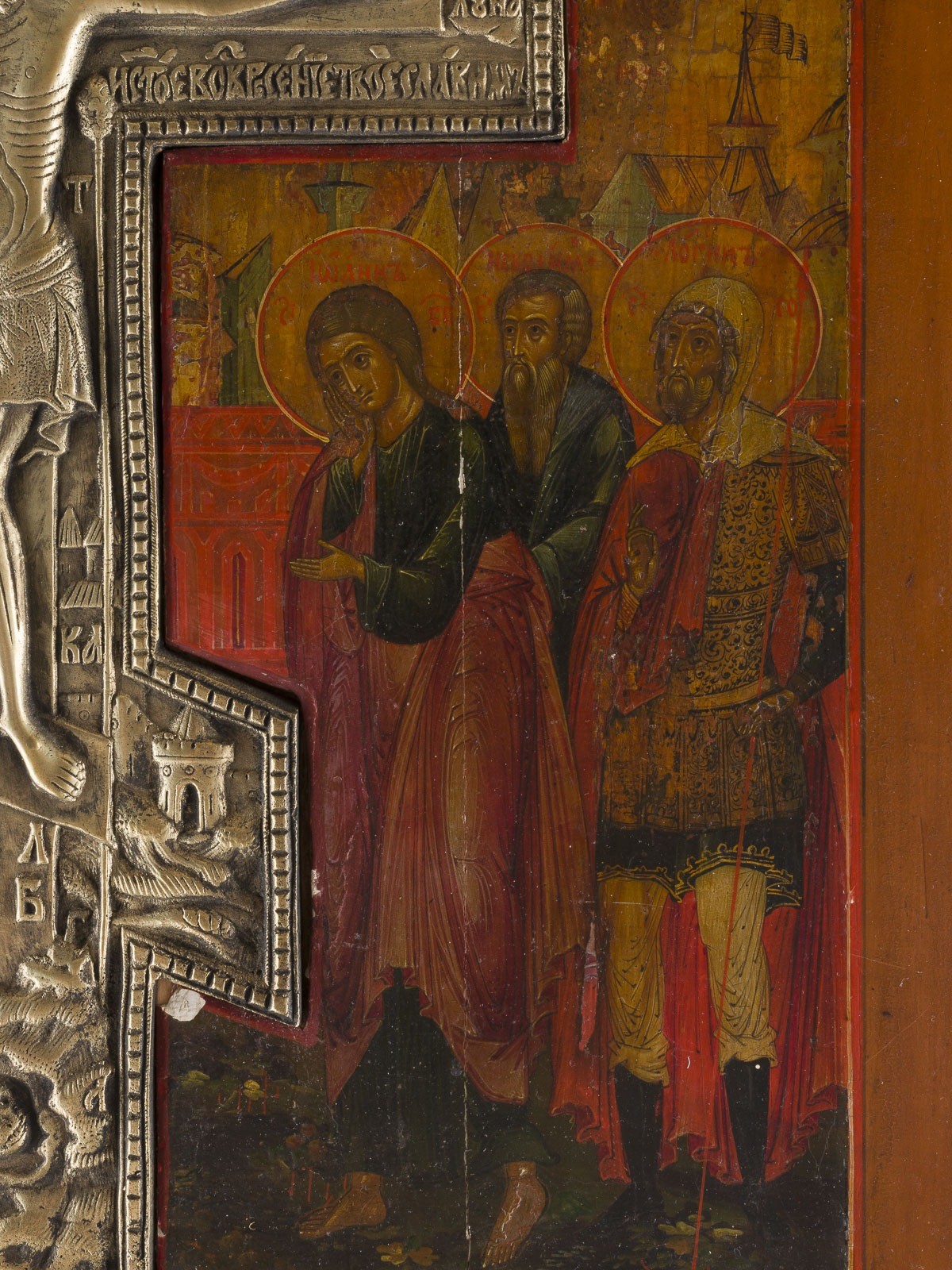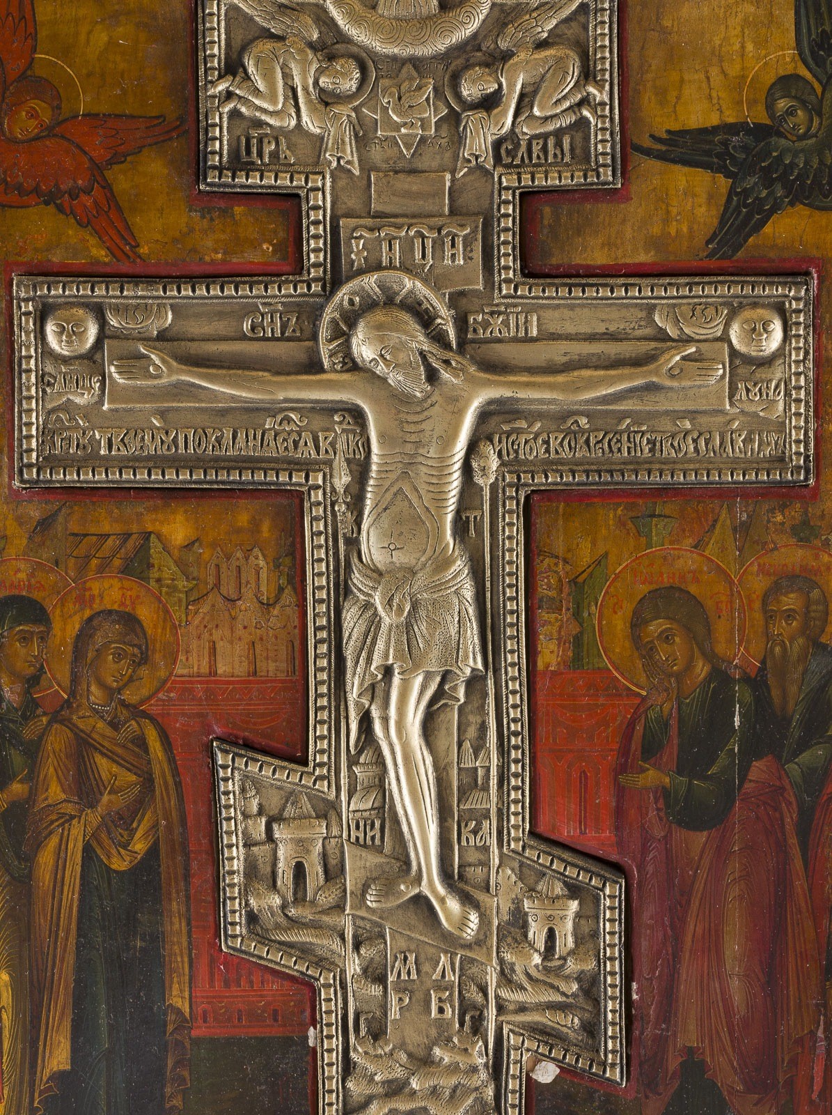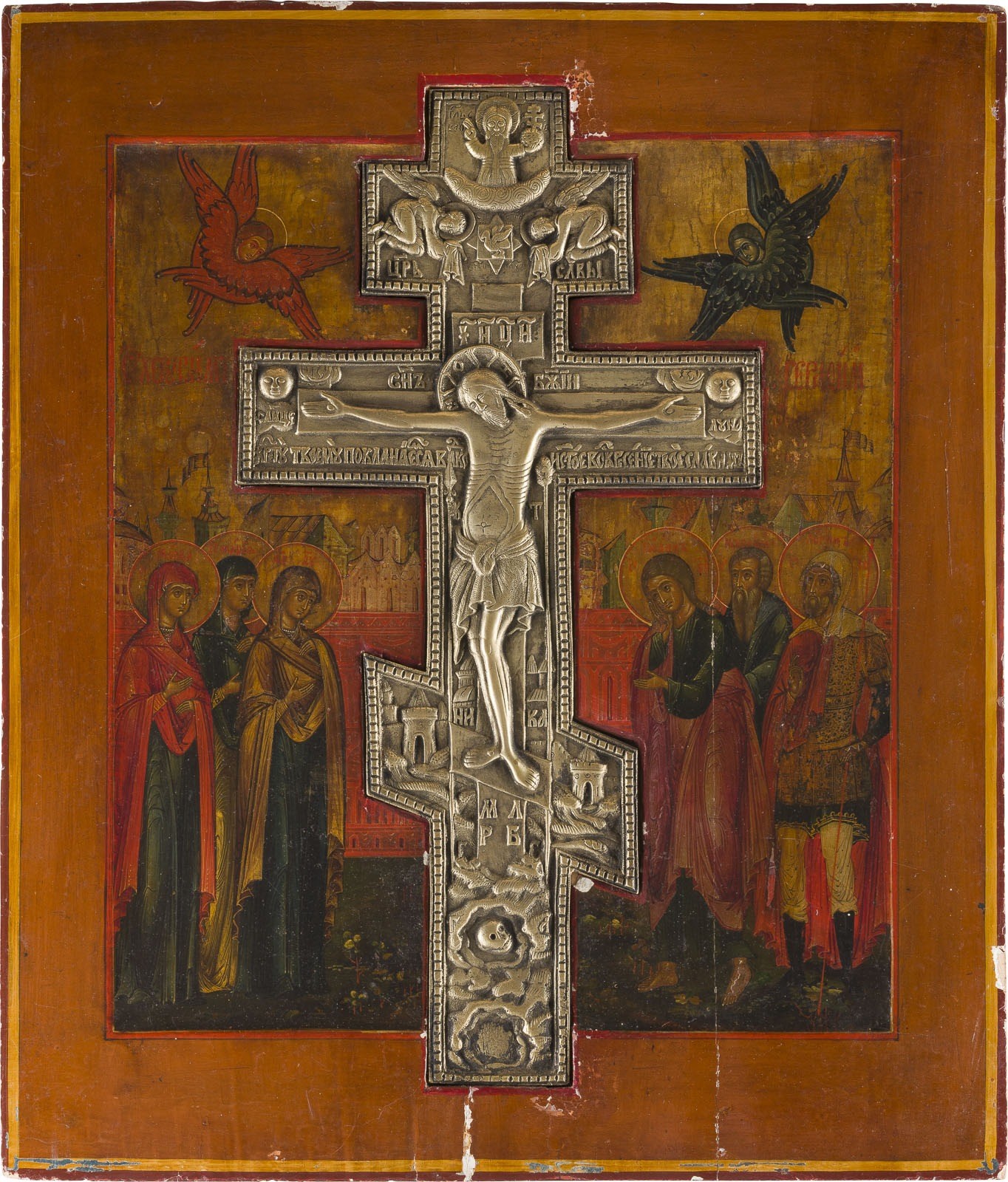 A LARGE STAUROTHEK ICON SHOWING THE CRUCIFIXION OF CHRIST Russian, 19th century Tempera on wood panel with kovcheg. The background made of silver, covered by a golden lacquer. A brass crucifix inserted in the panel. Minor vertical crack, minimally restored. 44.2 x 37.8 cm.