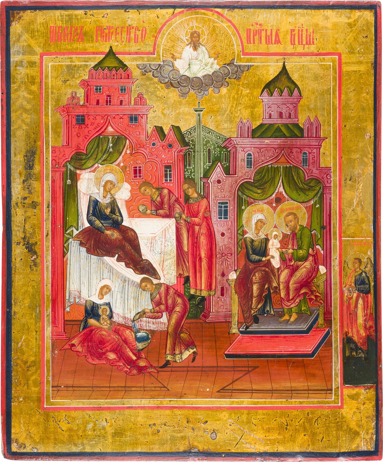 A LARGE AND FINE ICON SHOWING THE NATIVITY OF THE MOTHER GOD Russian, early 19th century Tempera on wood panel. The background made of silver, covered by a golden lacquer. The border incised with foliage. On the right borders appears the Archangel Michael. Minor areas of retouching, minimally worn. 45.4 x 37.7 cm.