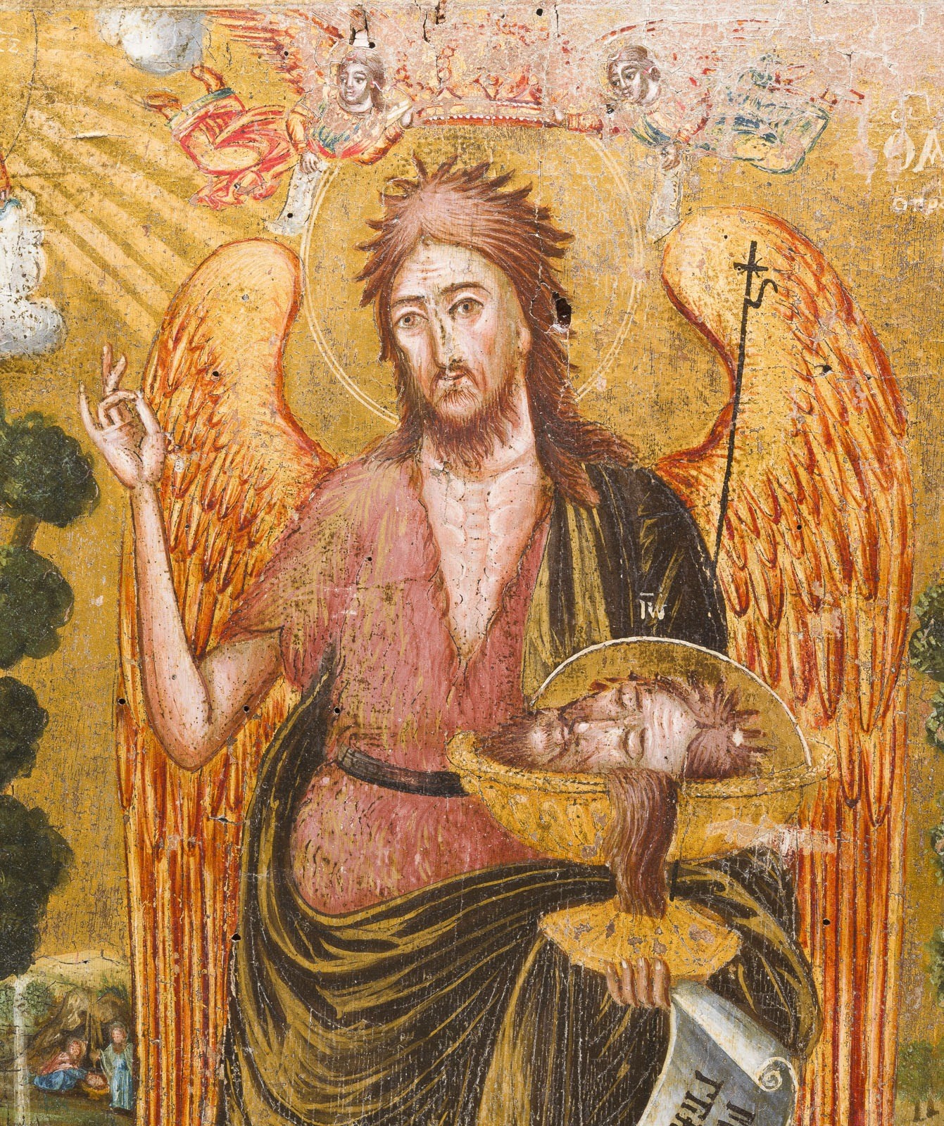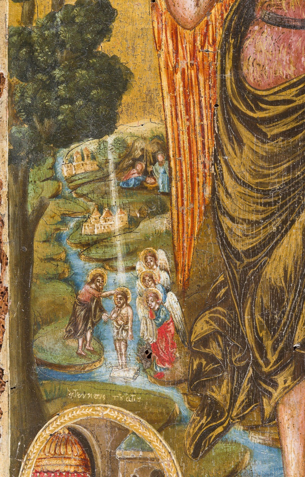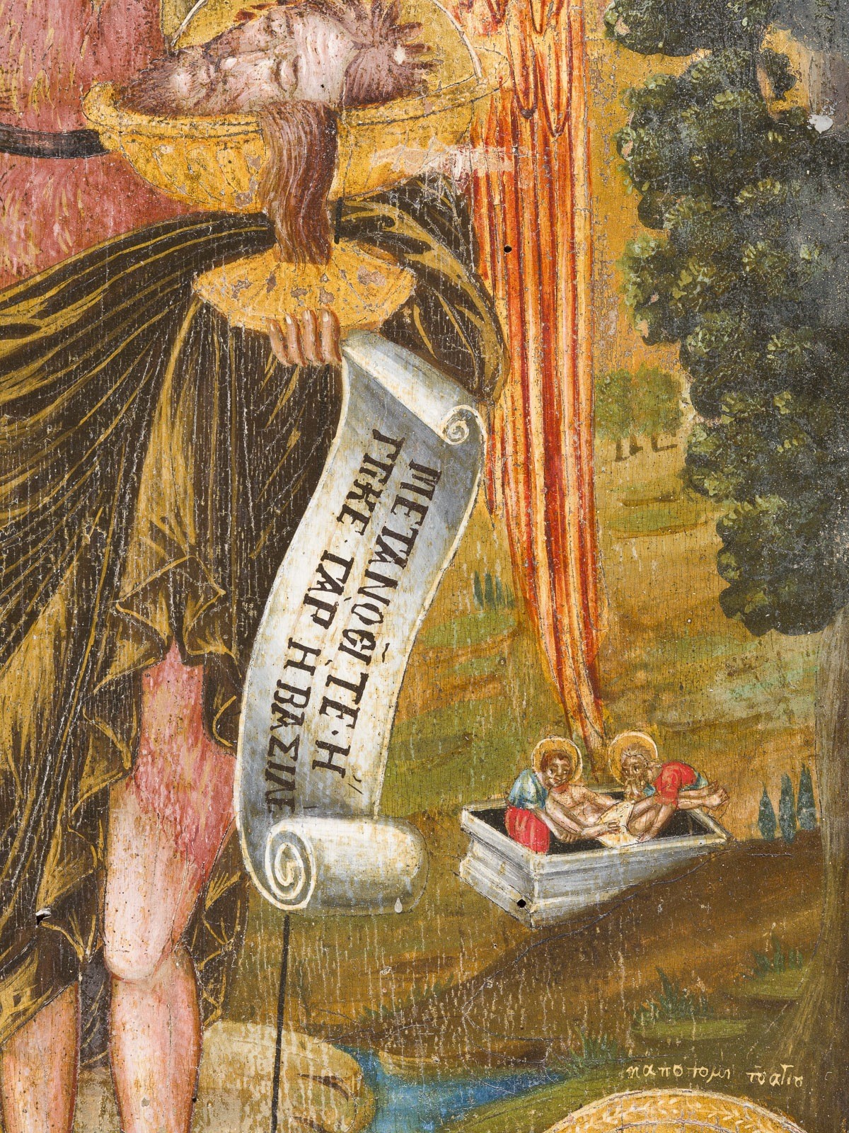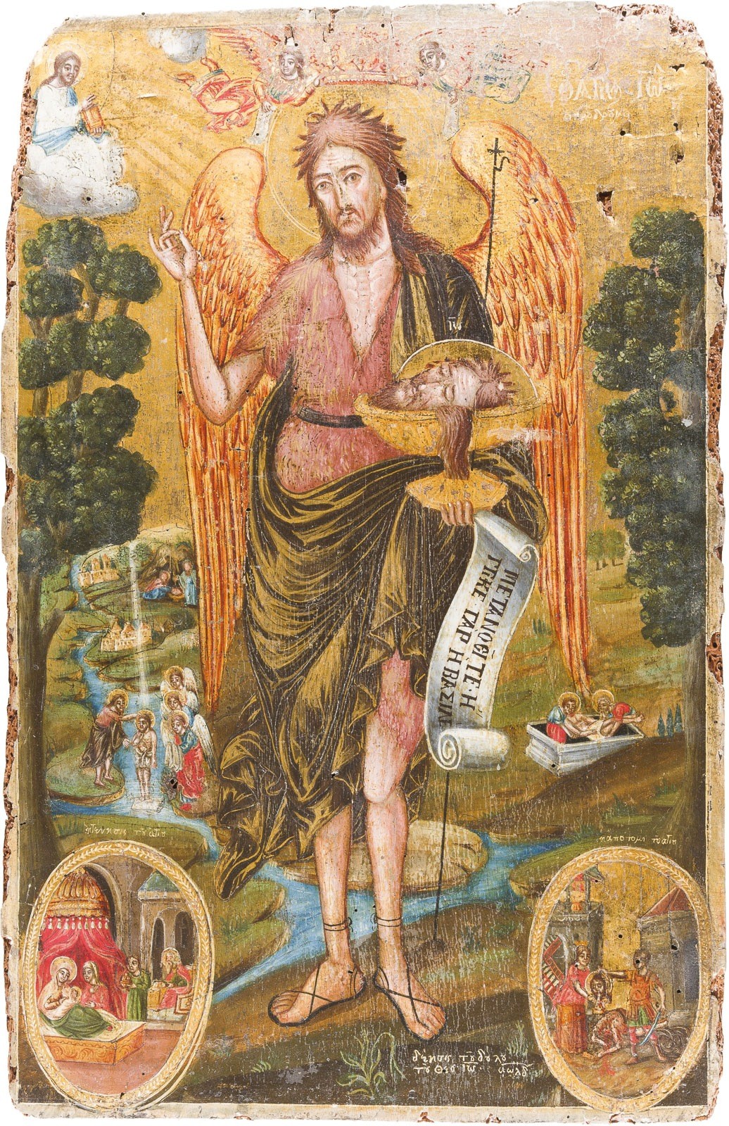 A LARGE DATED ICON SHOWING ST. JOHN THE FORERUNNER WITH SCENES FROM HIS LIFE Greek, dated 1834 Tempera on wood panel. The haloes and background made of gold. Signed in Greek and dated lower right. Evidence of old woodworm to the reverse, losses, partially restored. 56 x 36.3 cm.