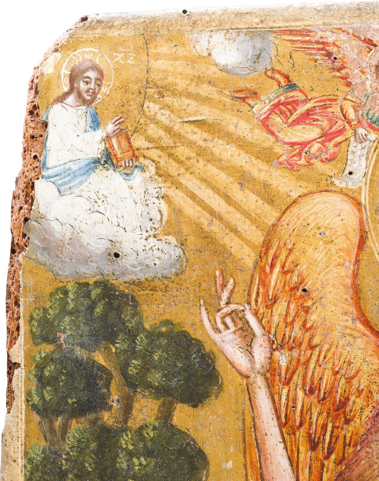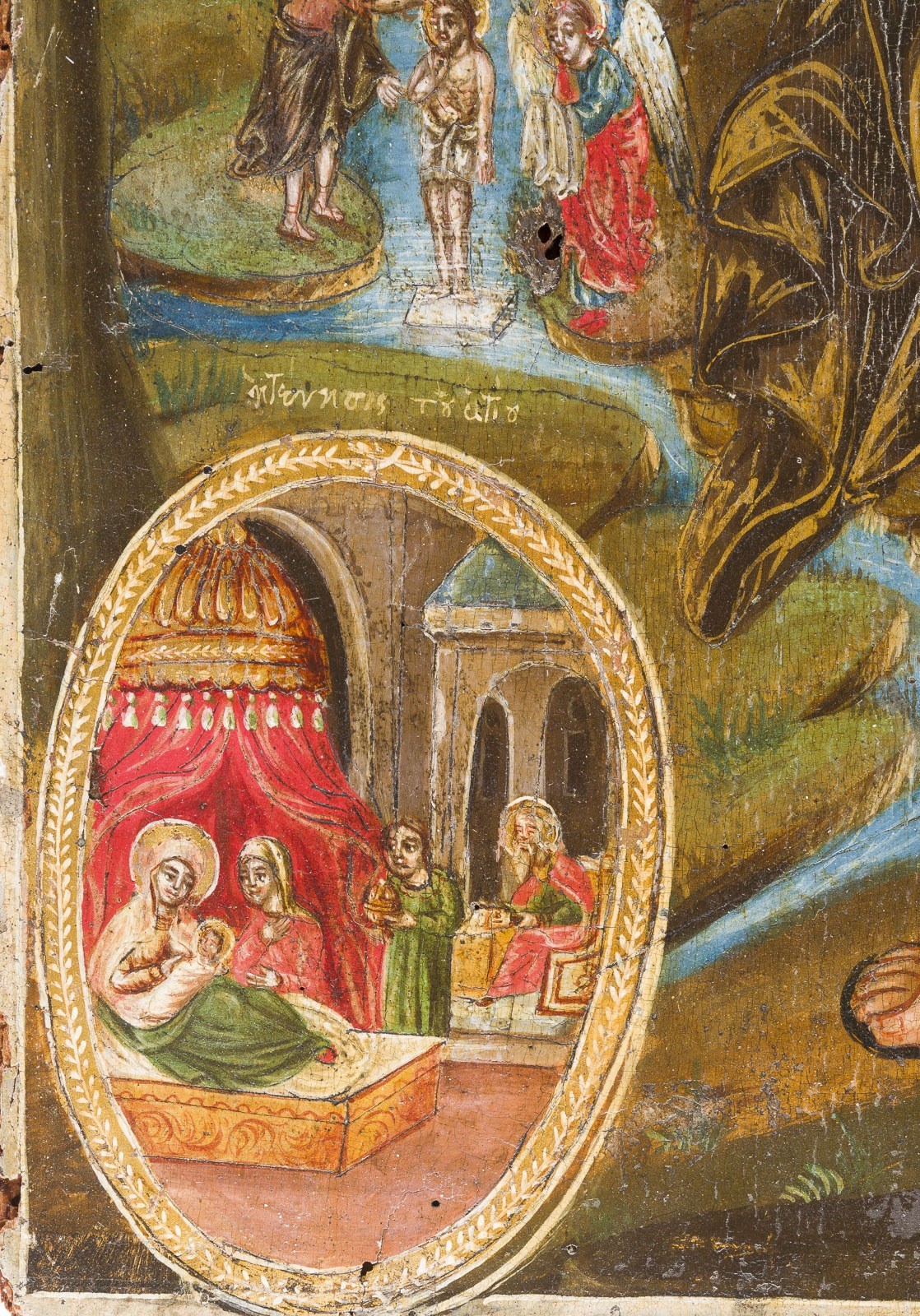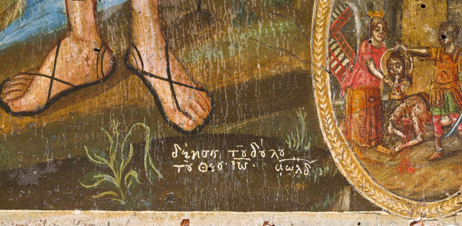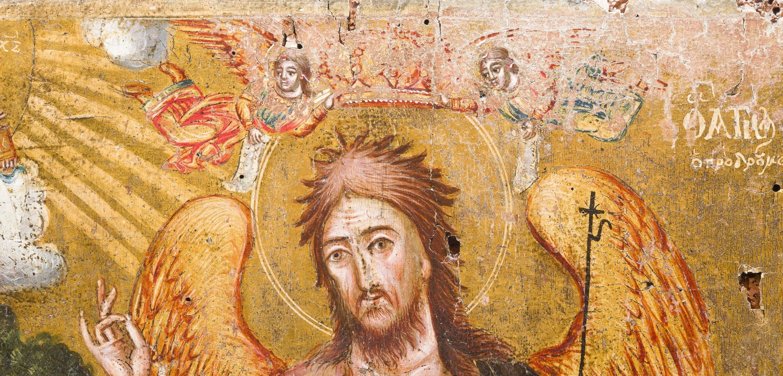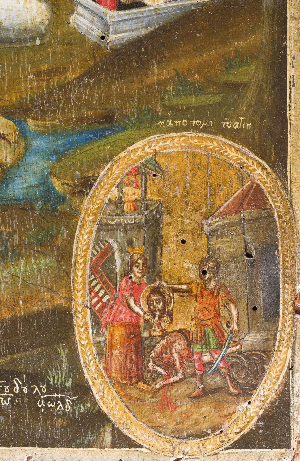 A LARGE DATED ICON SHOWING ST. JOHN THE FORERUNNER WITH SCENES FROM HIS LIFE Greek, dated 1834 Tempera on wood panel. The haloes and background made of gold. Signed in Greek and dated lower right. Evidence of old woodworm to the reverse, losses, partially restored. 56 x 36.3 cm.