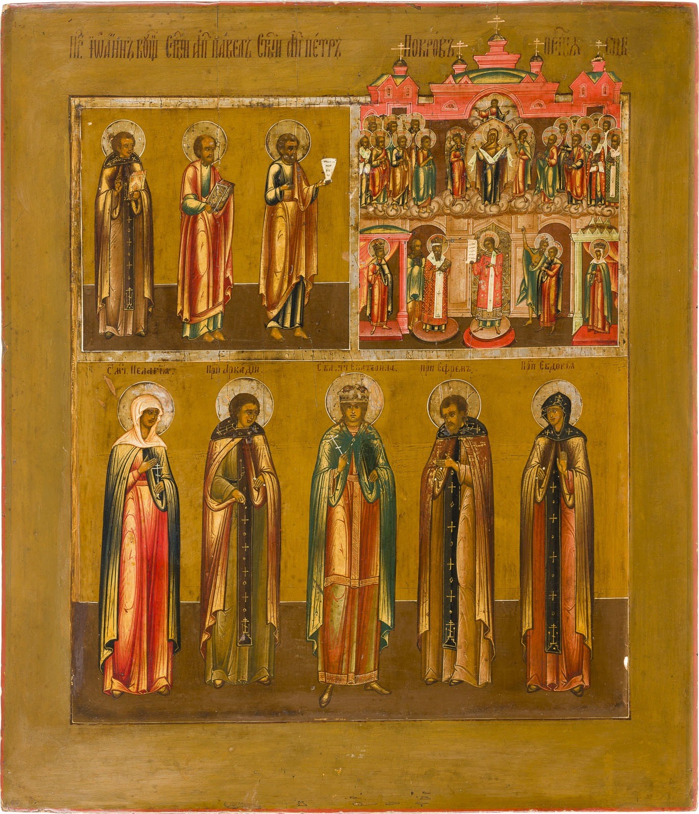 A LARGE TRI-PARTITE ICON SHOWING SELECTED SAINTS AND THE PROTECTING VEIL OF THE MOTHER OF GOD (POKROV) Russian, mid 19th century Tempera on wood panel with kovcheg. The haloes made of silver, covered by a golden lacquer. 43.9 x 38.4 cm.