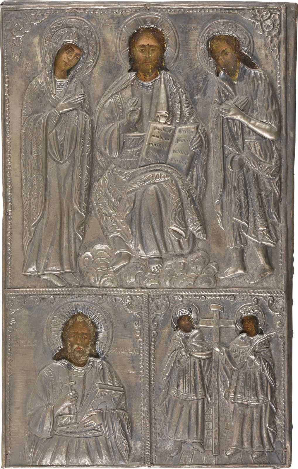A LARGE TRI-PARTITE ICON SHOWING THE DEISIS, ST. ANDREW THE APOSTLE AND STS. CONSTANTINE AND HELENA WITH SILVER OKLAD Romanien, 19th century Oil on wood panel. Overlaid with a richly chased and embossed silver oklad. Marked with standard '800'. Minor areas of retouching. 50.2 x 31.5 cm.