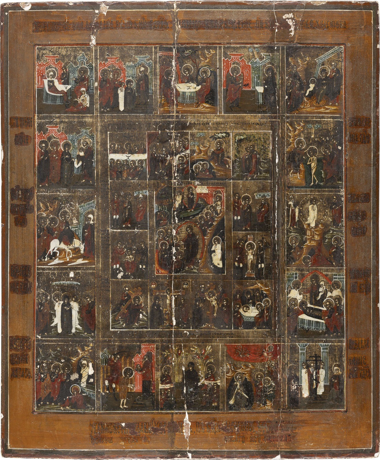 A LARGE ICON OF THE ANASTASIS WITH THE PASSION CYCLE AND THE MAIN ECCLECIASTICAL FEASTS Russian, 19th century Tempera on wood panel. The background made of silver, covered by a golden lacquer. Vertical cracks restored, losses. 44.4 x 37 cm.