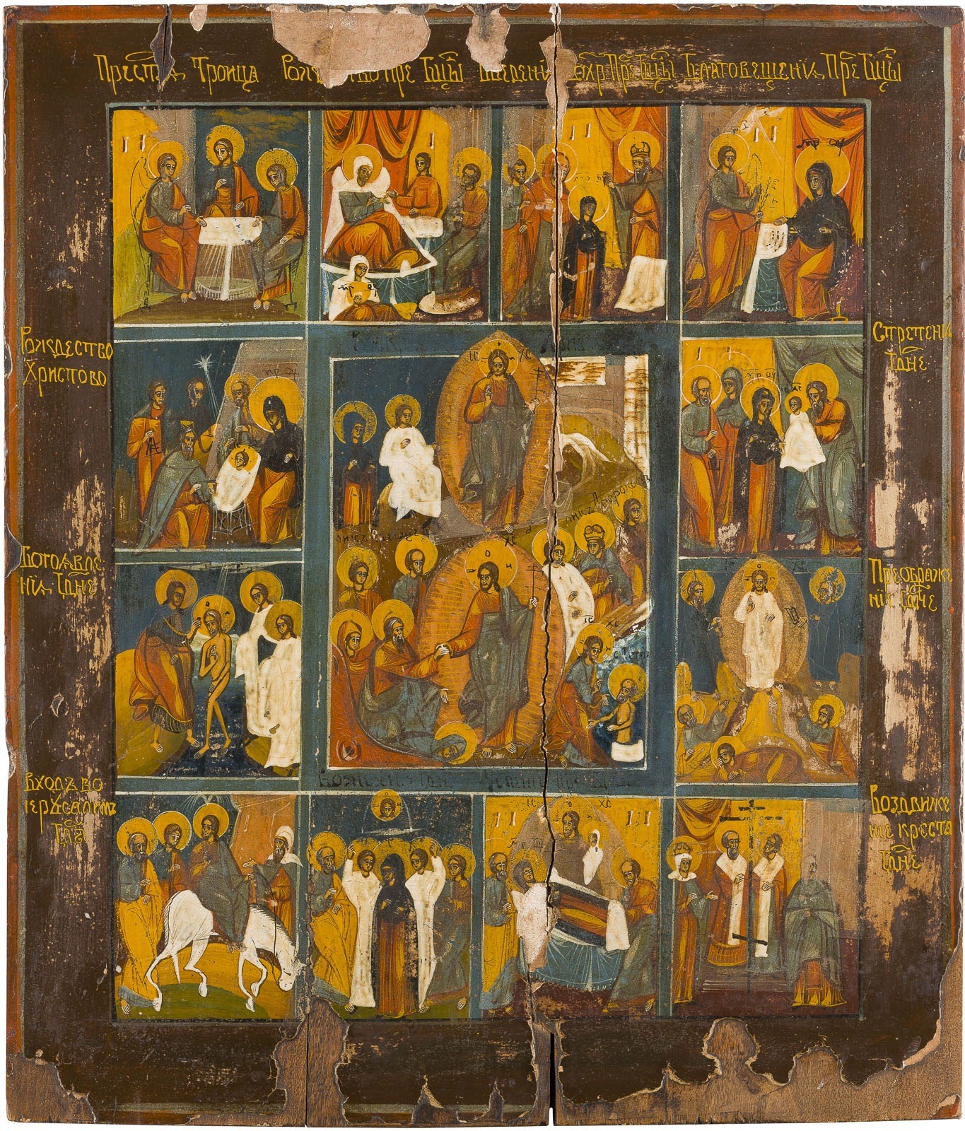 A LARGE FESTIVAL ICON Russian, 19th century Tempera on wood panel. Vertical cracks, losses. 41.6 x 35.7 cm.