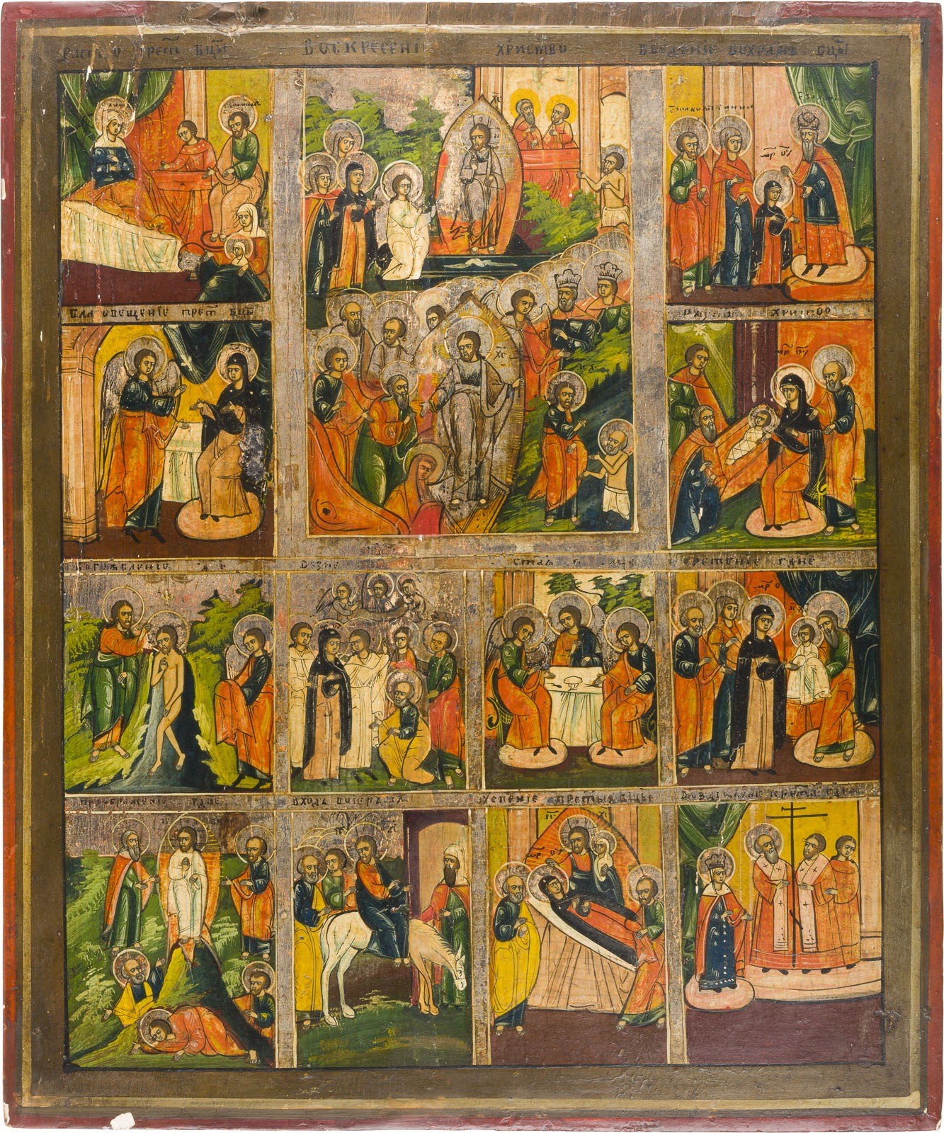 A LARGE ICON SHOWING THE RESURRECTION OF CHRIST AND THE DESCENT INTO HELL SURROUNDED BY TWELVE FESTIVALS Russian, 19th century Tempera on wood panel. The haloes and borders made of silver. The edges minimally chipped, vertical crack restored. 47.3 x 39.5 cm.
