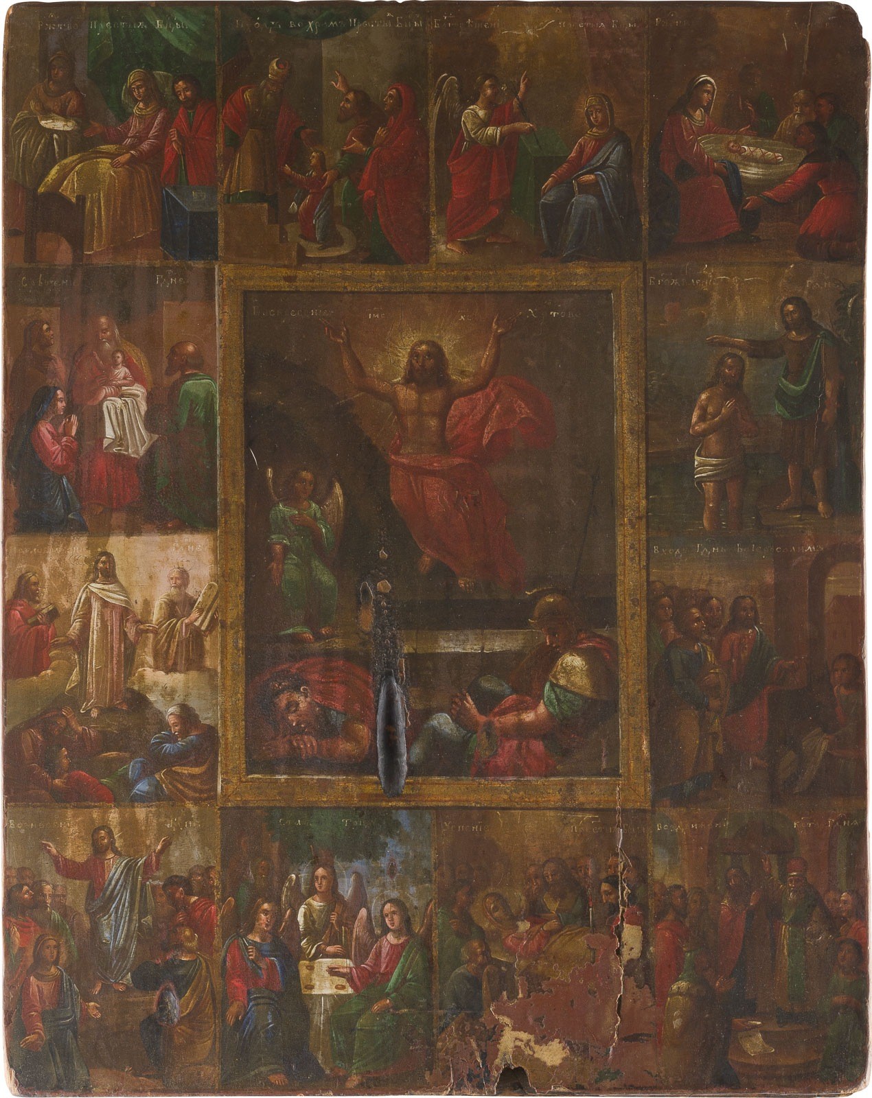 A LARGE ICON SHOWING THE RESURRECTION OF CHRIST SURROUNDED BY TWELVE MAJOR FEASTS Russian, mid 19th century Oil on wood panel. Damages to the edges, burn mark. 47.5 x 37 cm.