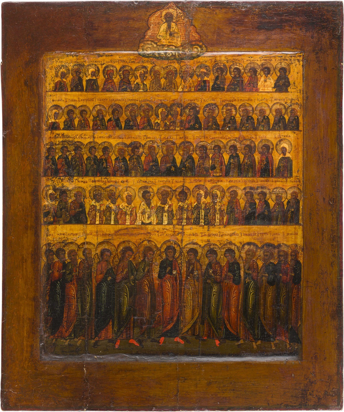 A VERY LARGE ICON SHOWING A SELECTION OF SAINTS: ARCHANGELS, PROPHETS, BISHOPS, MARTYRS AND SAINTS Russian, 18th century Tempera on wood panel with kovcheg. The haloes made of gold. Partially restored. 52.7 x 44.4 cm.