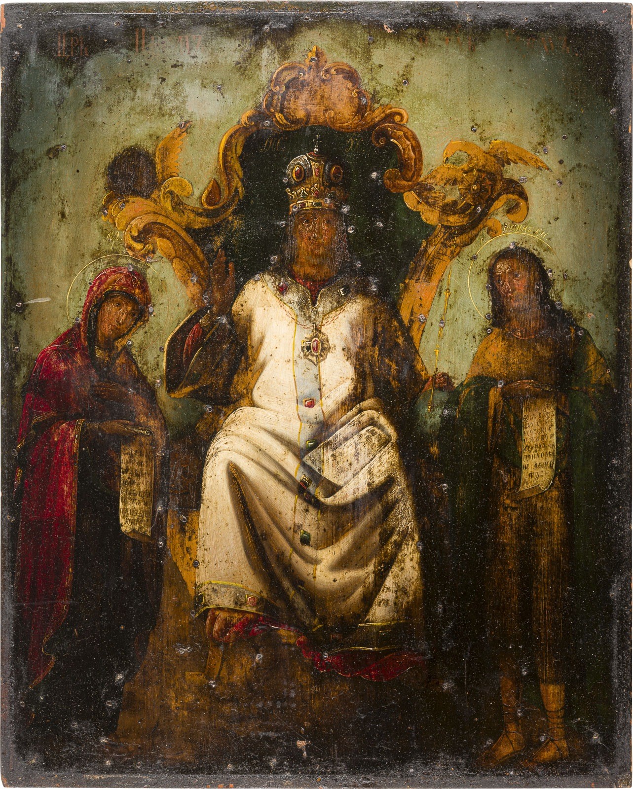 A LARGE ICON SHOWING CHRIST AS HIGH PRIEST FLANKED BY THE MOTHER OF GOD AND ST. JOHN Russian, mid 19th century Oil on wood panel. The paint surface is dirty. 53.3 x 43 cm.