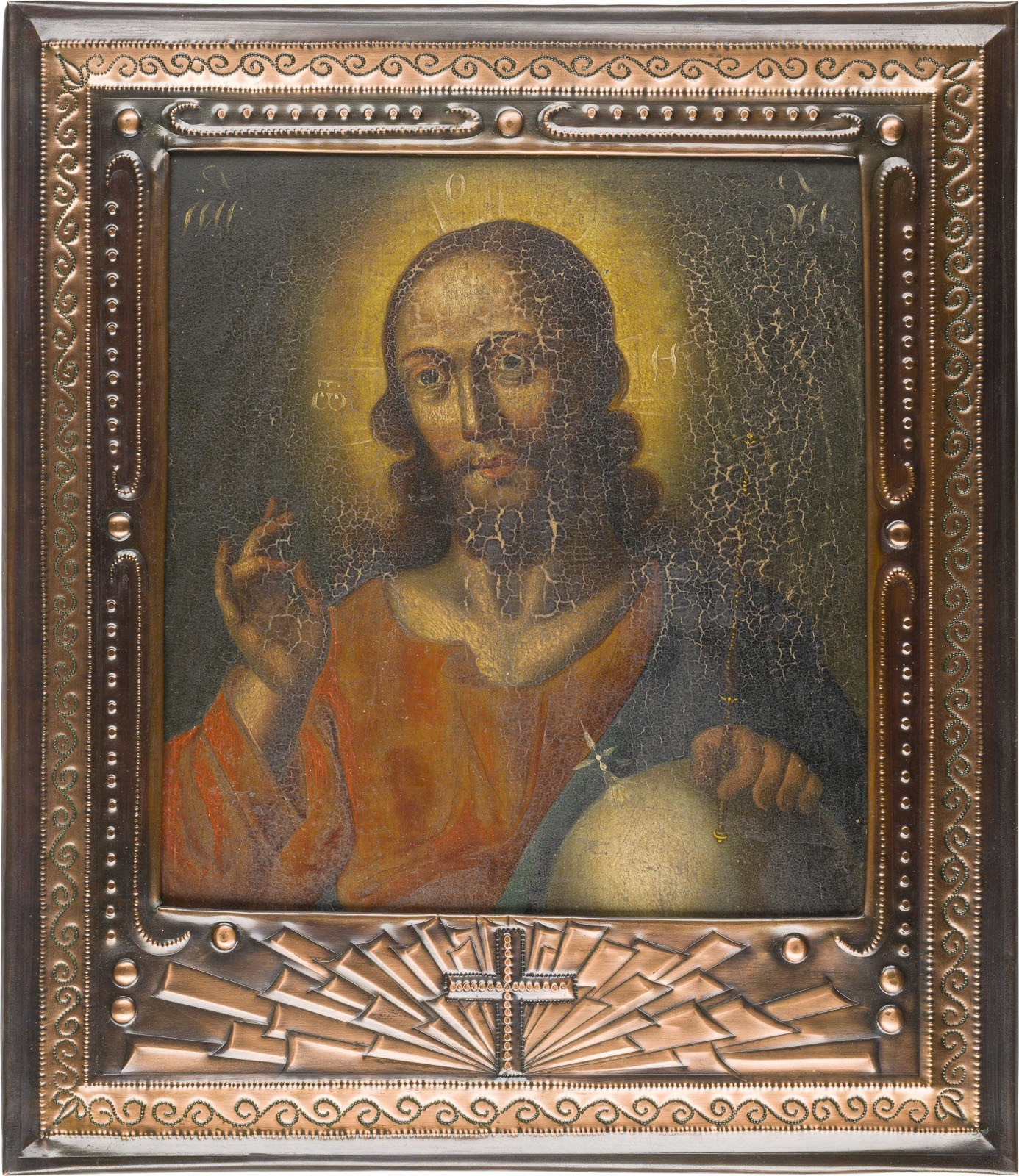 A LARGE ICON SHOWING CHRIST THE SAVIOUR Russian, 1st half of the 19th century Oil on wood panel. Damages. 43.7 x 38.5 cm (with modern frame).
