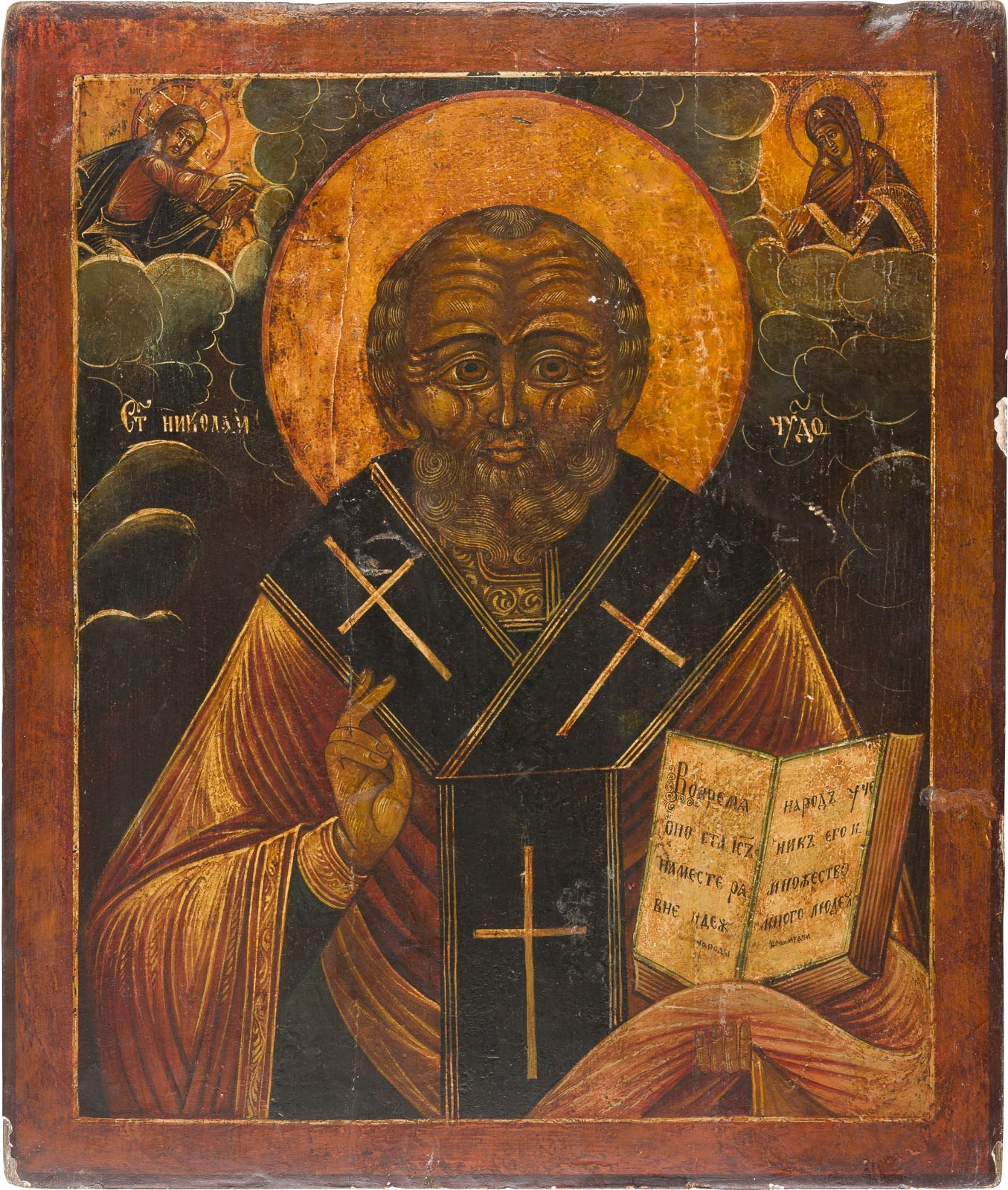 A VERY LARGE ICON SHOWING ST. NICHOLAS OF MYRA Russian, 18th century Tempera on wood panel. Minor damages to the borders, minor areas of retouching. 53.5 x 45.1 cm.