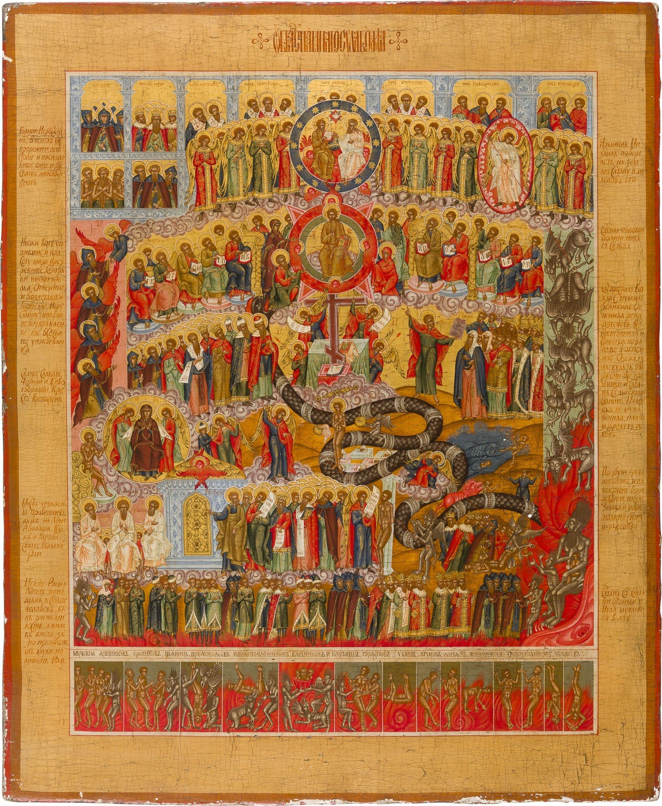 A VERY LARGE ICON SHOWING THE LAST JUDGEMENT Recent Oil on canvas laid down on wood panel. The haloes and background made of gold. Minor chips to the edges. 63.5 x 52.6 cm.