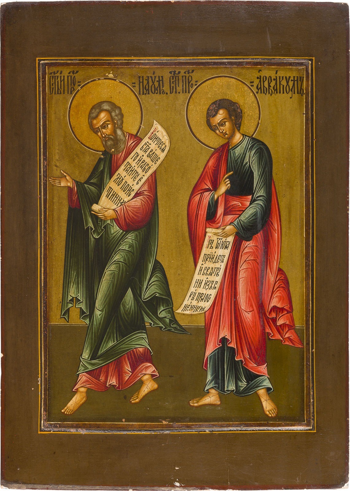 A LARGE ICON WITH THE OLD TESTAMENT PROPHETS NAHUM AND HABAKKUK FROM A CHURCH ICONOSTASIS Russian, 19th century Tempera on wood panel with kovcheg. The haloes made of gold. Minor losses. 54.3 x 39.1 cm.