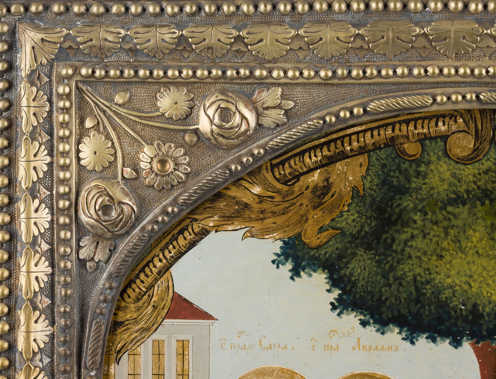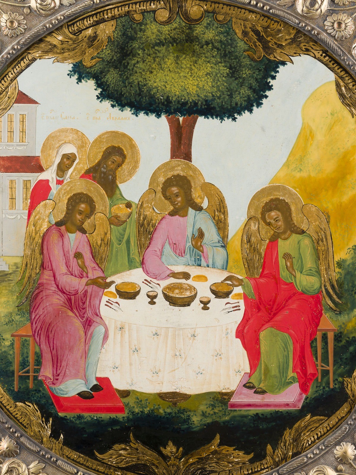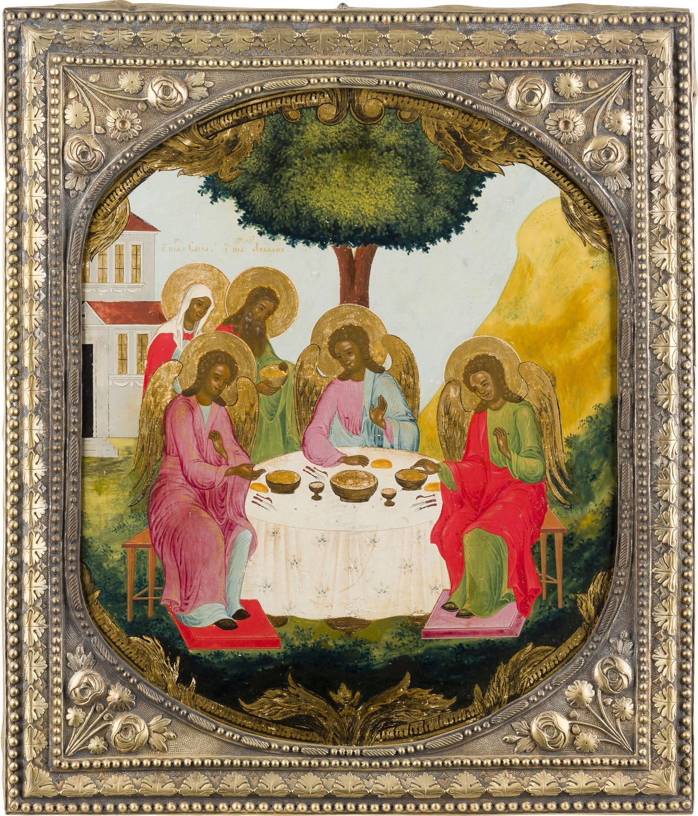A LARGE AND FINE ICON SHOWING THE OLD TESTAMENT TRINITY WITH BASMA Russian, early 19th century Tempera on wood panel. The haloes and the ornately painted border made in gold. Finely painted in bright colours. The brass basma chased and repoussé with foliage and flowers. Minor areas of retouching. 49.2 x 42 cm.