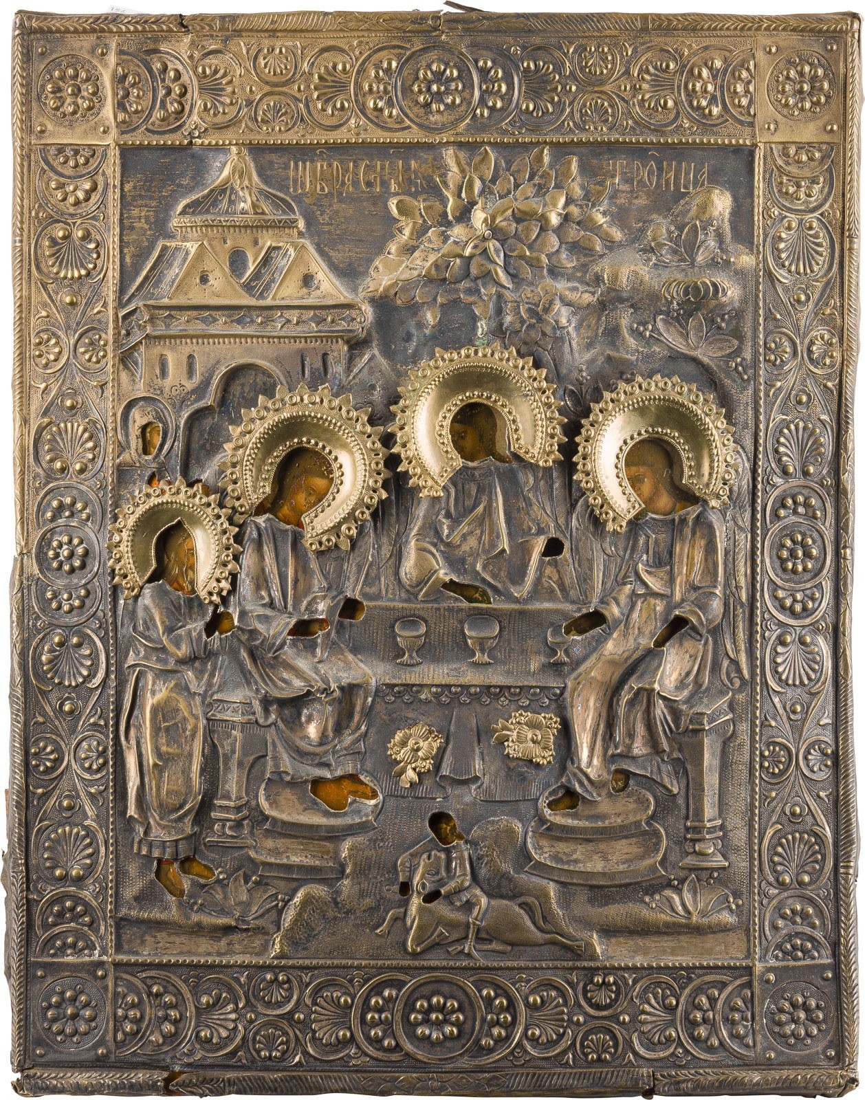 A LARGE ICON SHOWING THE OLD TESTAMENT TRINITY WITH OKLAD Russian, 1st half of the 19th century Tempera on wood panel. The haloes made of silver. Overlaid with a chased and embossed brass oklad. Restorations, damages. 42.5 x 33.8 cm.