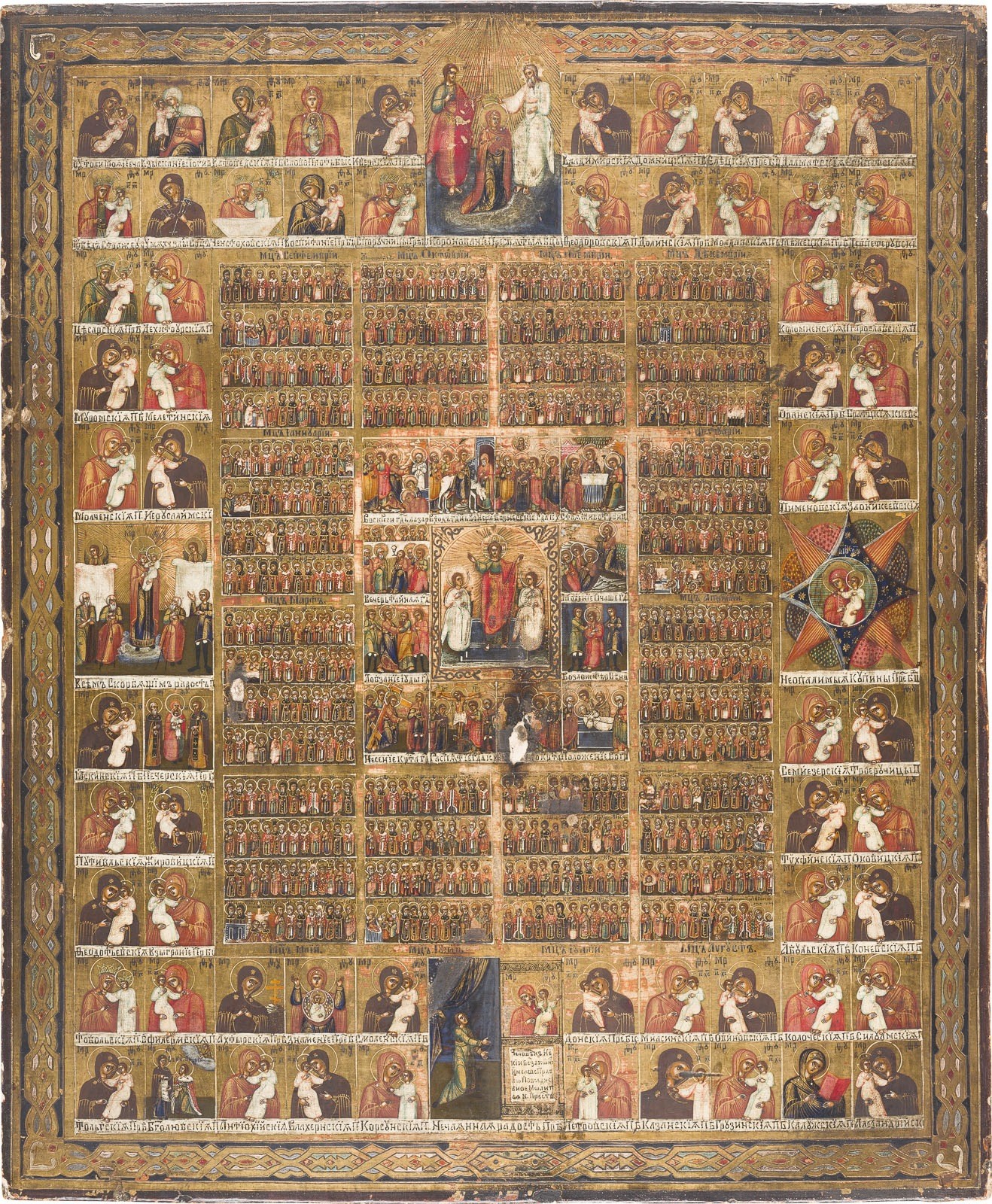 A VERY LARGE MENOLOGICAL ICON FOR THE WHOLE YEAR WITH THE PASSION CYCLE AND 68 IMAGES OF THE MOTHER OF GOD Russian, late 19th century Tempera on wood panel. Painted with deep colours on gold background. Minor paint losses. 52.7 x 43.8 cm.