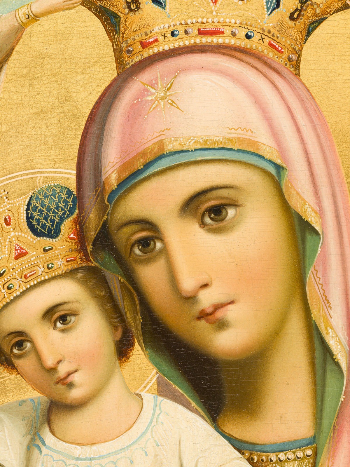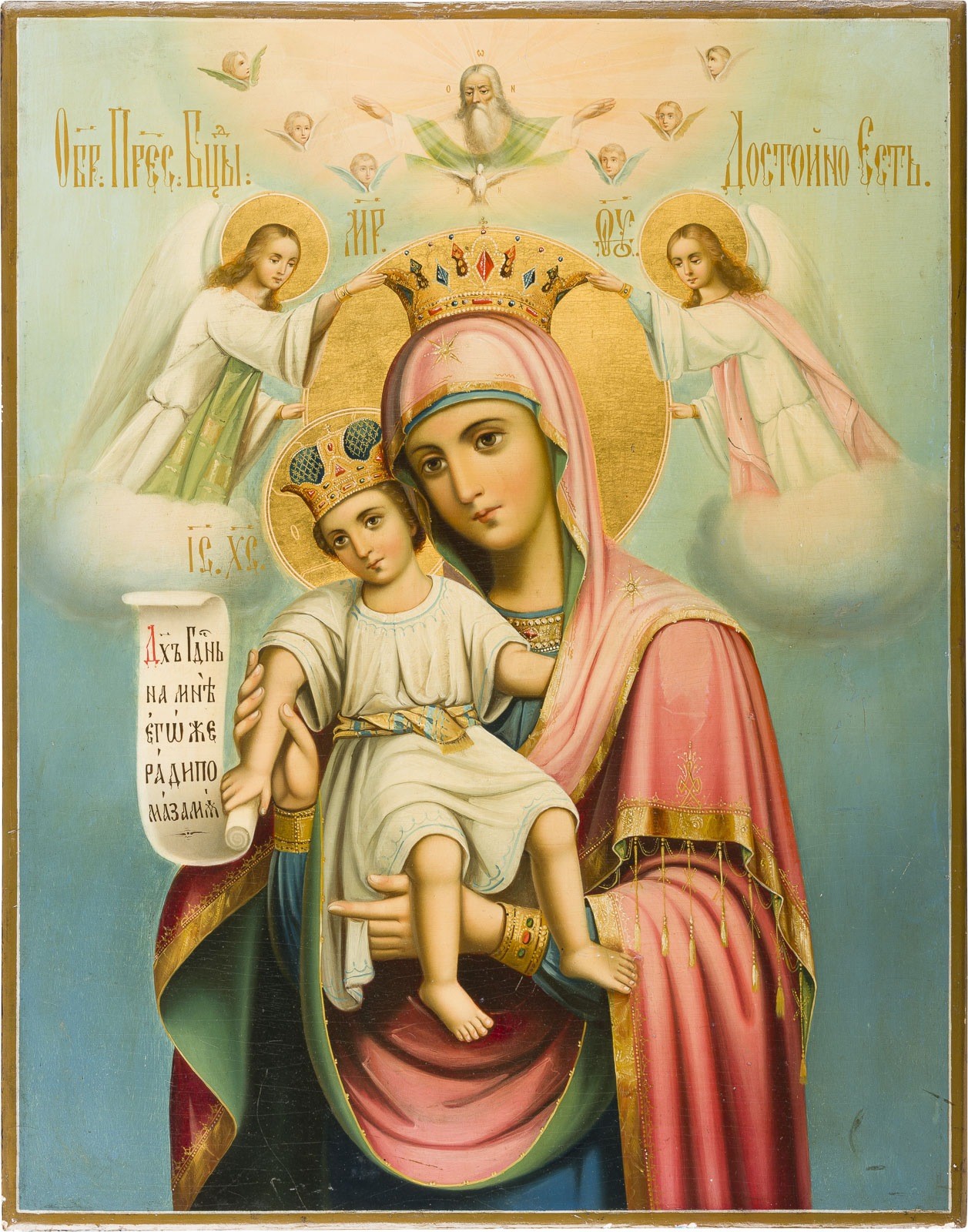 A LARGE ICON SHOWING THE MOTHER OF GOD 'AXION ESTIN' (DOSTOYNO EST) Mount Athos, Skete of Prophet Elijah, circa 1900 Oil on wood panel. The haloes made of gold. On the reverse Cyrillic stamp. 53 x 41.8 cm.