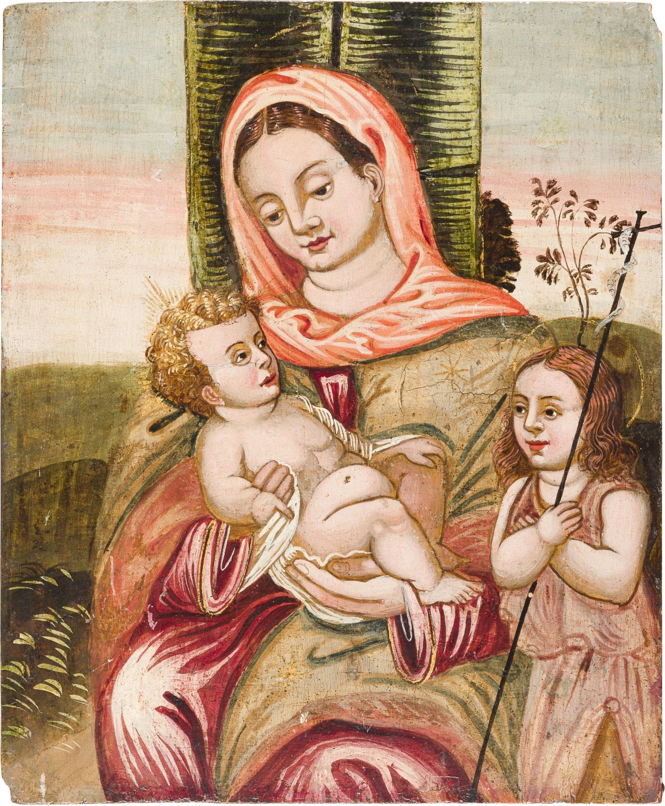 A LARGE ICON SHOWING THE MOTHER OF GOD AND ST. JOHN AS CHILD Veneto-Cretan, circa 1600 Tempera on wood panel. The haloes made of gold. Painted naturalistically mostly with browns, maroons and complimentary greens. Minor areas of retouching to the edges. 43.7 x 36.2 cm.