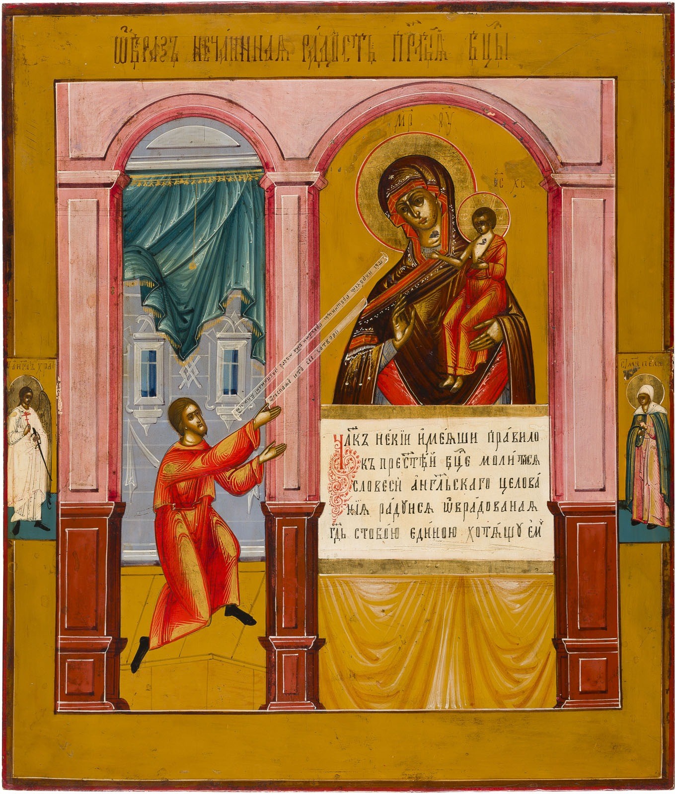 A LARGE ICON SHOWING THE MOTHER OF GOD 'THE UNEXPECTED JOY' Russian, 19th century Tempera on wood panel. The haloes made of gold. Two selected saints on the borders: Guardian Angel and St. Pelagia. Minor areas of retouching. 44.1 x 38 cm.