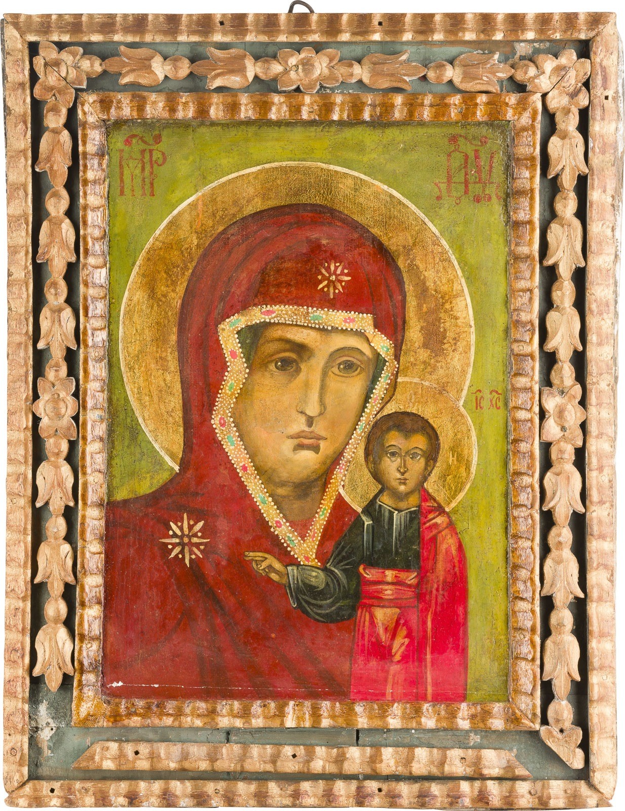 A VERY LARGE ICON SHOWING THE KAZANSKAYA MOTHER OF GOD Russian, circa 1800 Tempera on wood panel. The haloes made of gold. Restored. Within a carved frame. 56 x 43 cm.