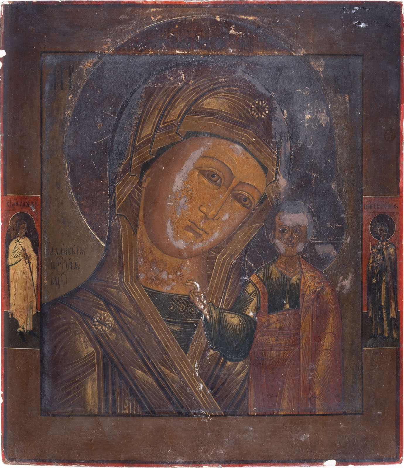 A VERY LARGE ICON SHOWING THE KAZANSKAYA MOTHER OF GOD Russian, Guslicy, 2nd half of the 19th century Tempera on wood panel with kovcheg. The haloes made of silver, covered by a golden lacquer. Two selected saints on the borders: Guardian Angel and St. Evgeniya. 44 x 38.3 cm.