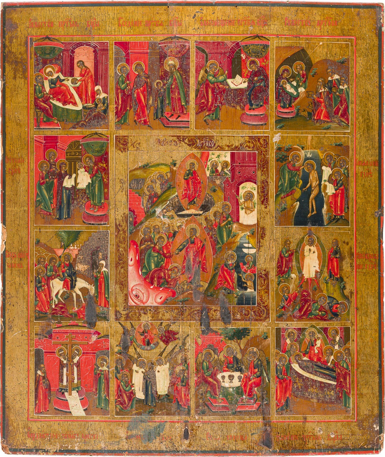 GROSSFORMATIGE IKONE MIT DER HÖLLENFAHRT UND AUFERSTEHUNG CHRISTI MIT ZWÖLF HOCHFESTEN DES ORTHODOXEN KIRCHENJAHRES