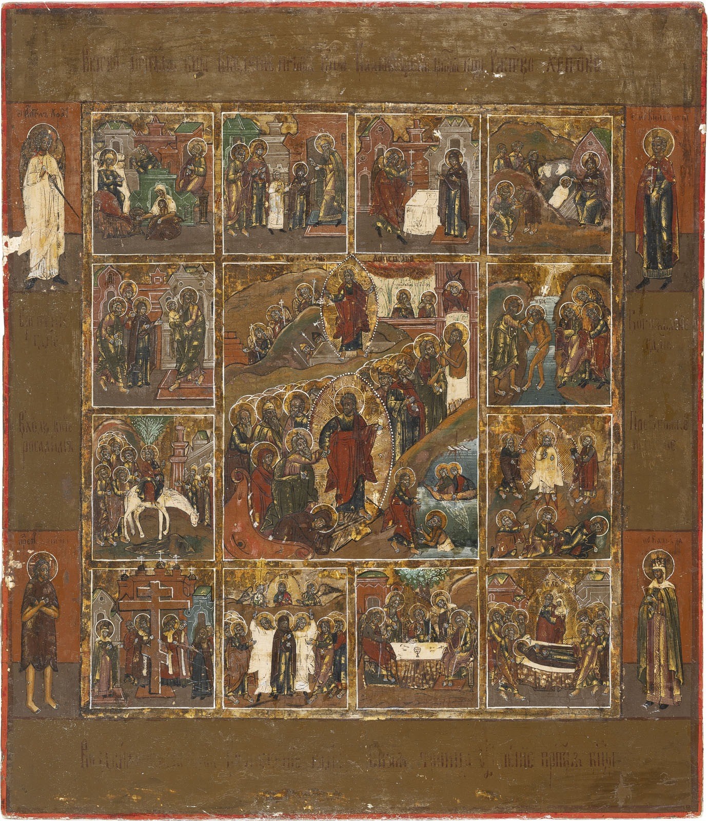 GROSSFORMATIGE IKONE MIT DER HÖLLENFAHRT UND AUFERSTEHUNG SOWIE ZWÖLF HOCHFESTEN