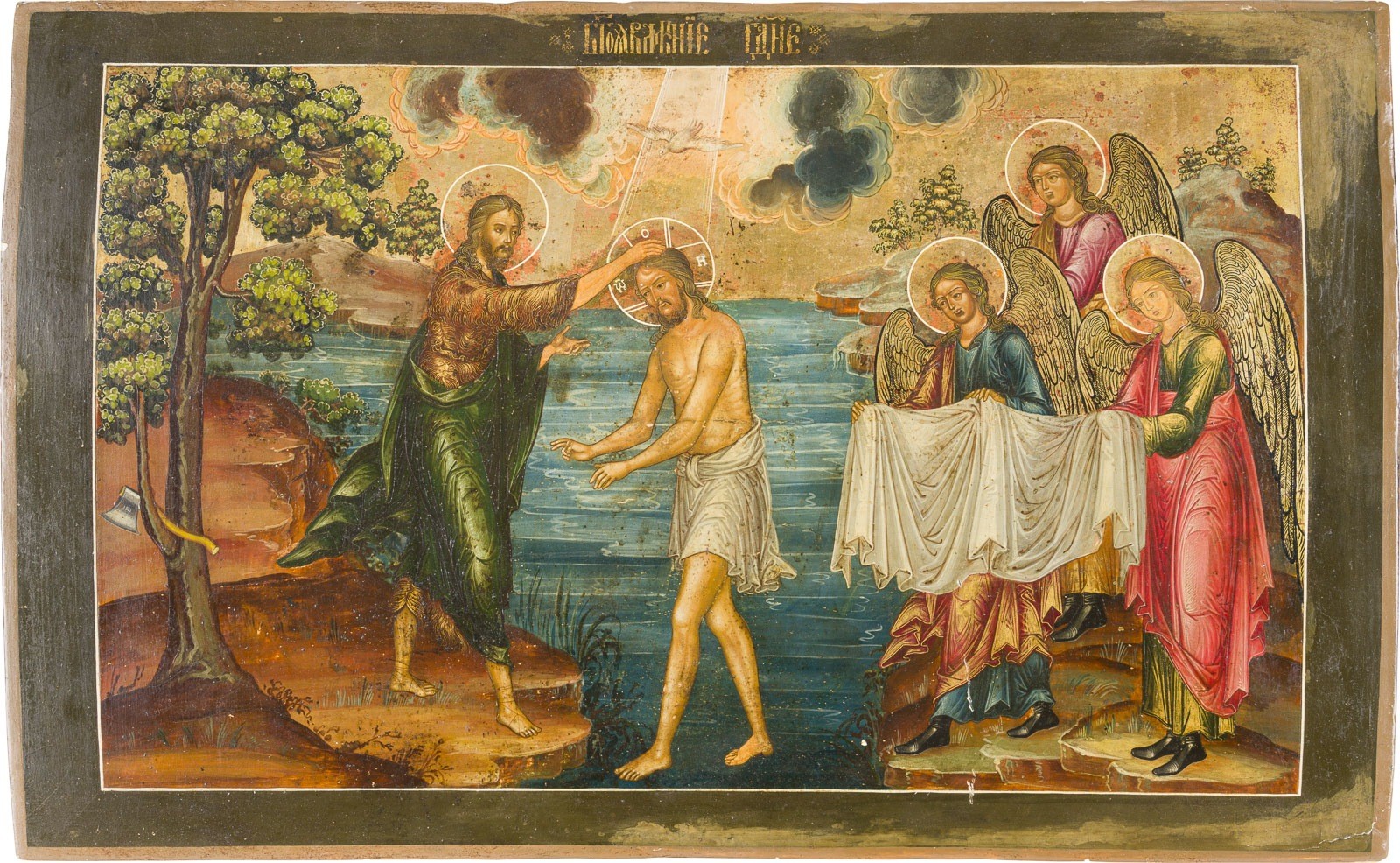 A LARGE ICON SHOWING THE BAPTISM OF CHRIST FROM A CHURCH ICONOSTASIS Russian, mid-19th century Tempera on wood panel. The background and haloes made of silver, covered by a golden lacquer. Minor areas of retouching. 34.8 x 55.3 cm.