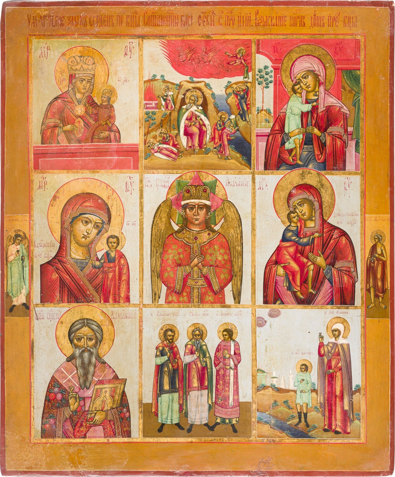GROSSFORMATIGE NEUN-FELDER-IKONE MIT GNADENBILDERN DER GOTTESMUTTER UND AUSGEWÄHLTEN HEILIGEN
