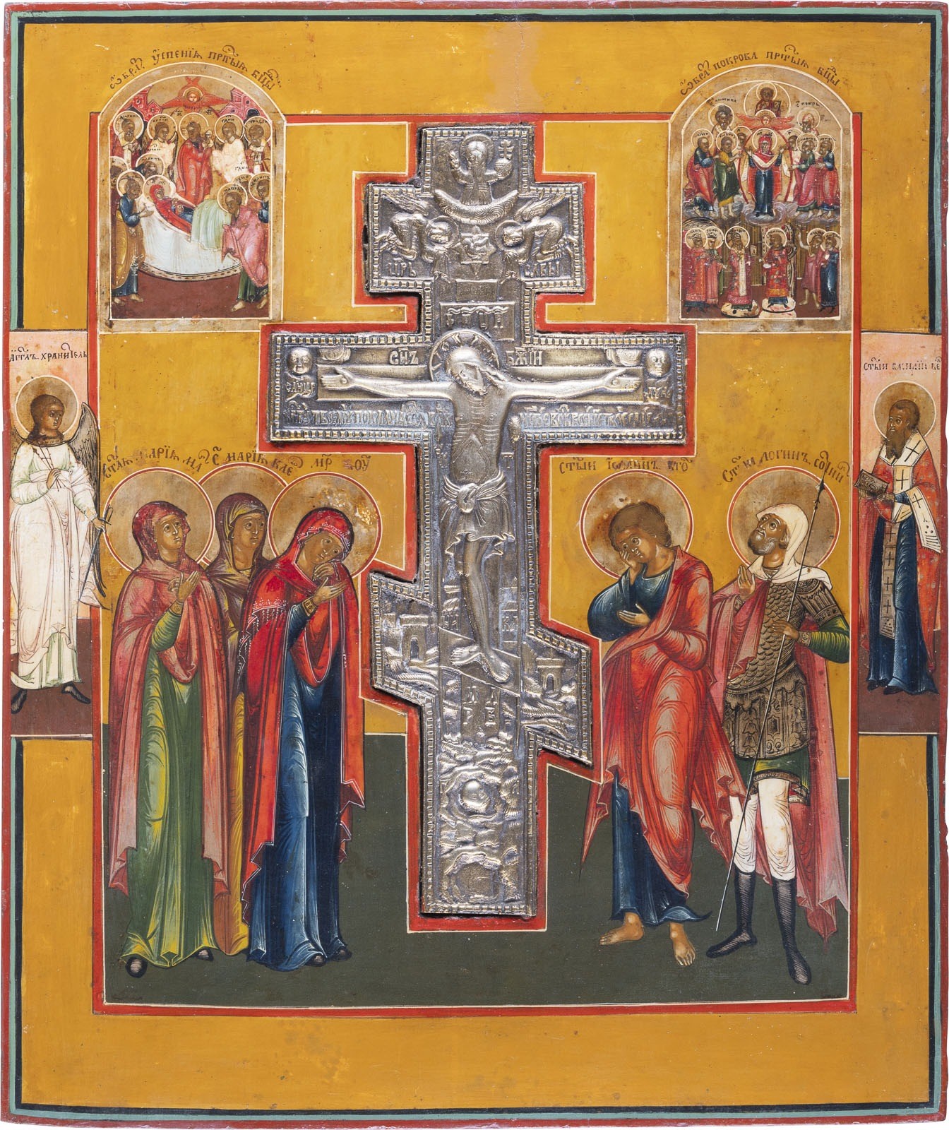 A VERY LARGE STAUROTHEK ICON SHOWING THE CRUCIFIXION, THE DORMITION OF THE MOTHER OF GOD AND THE POKROV Russian, 1st half of the 19th century Tempera on wood panel. The haloes made of silver, covered by a golden lacquer. A brass crucifix inserted into the panel. Two selected saints on the borders: Guardian Angel and St. Basil the Great. Minor areas of retouching. 52.5 x 44 cm.
