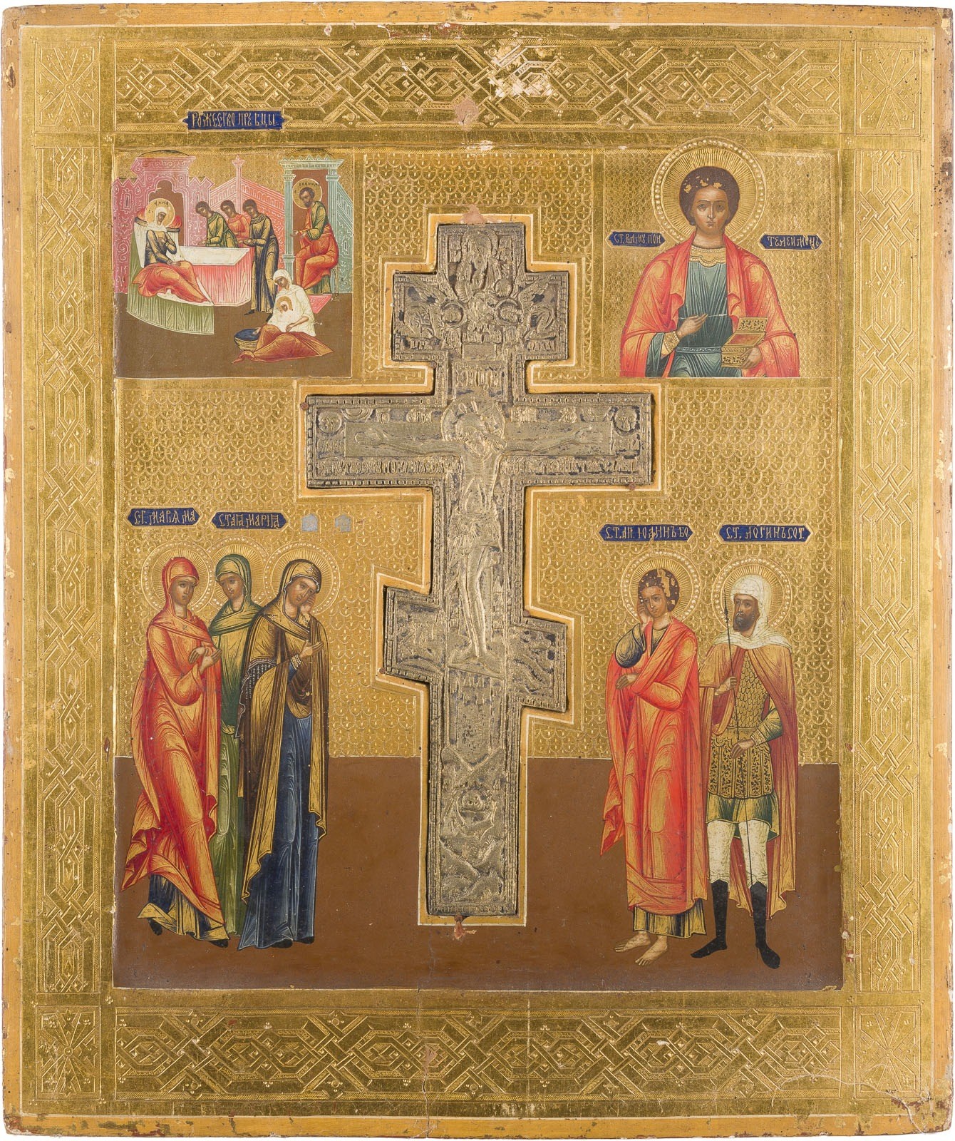 A LARGE STAUROTHEK ICON SHOWING THE CRUCIFIXION OF CHRIST, THE NATIVITY OF THE MOTHER OF GOD AND ST. PANTELEIMON Russian, late 19th century Tempera on wood panel with kovcheg. Executed on a gold ground. The background and border ornately incised. A brass crucifix set into the panel. Minor losses. 44.1 x 37.7 cm.