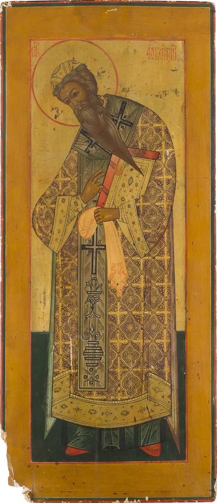 A VERY LARGE AND FINE ICON SHOWING ST. ALEXIS, METROPOLITAN OF MOSCOW FROM A CHURCH ICONOSTASIS Russian, 19th century Tempera on wood panel with kovcheg. The halo and background made of silver, covered by a golden lacquer. Evidence of old woodworm to the reverse, damages to the edges, losses. 70.8 x 31 cm.