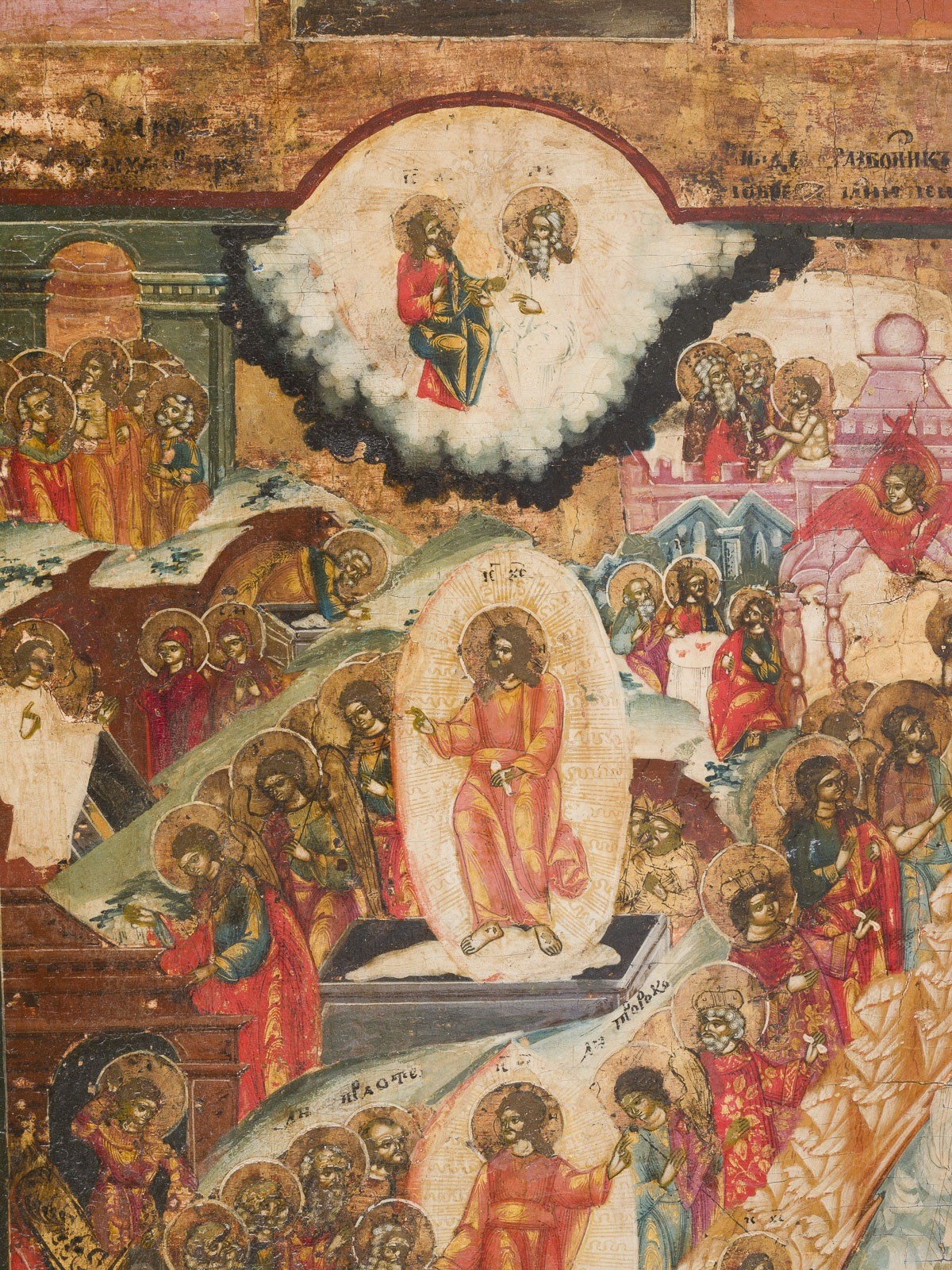 A LARGE AND FINE ICON OF THE RESURRECTION AND DESCENT WITH SIXTEEN MAJOR FEASTS Russian, Nevyansk, circa 1800 Tempera on wood panel. The haoes and background made of gold. The icon finely painted with extensive ornamental detail and chrysography. Restorations. 52.3 x 40.7 cm.