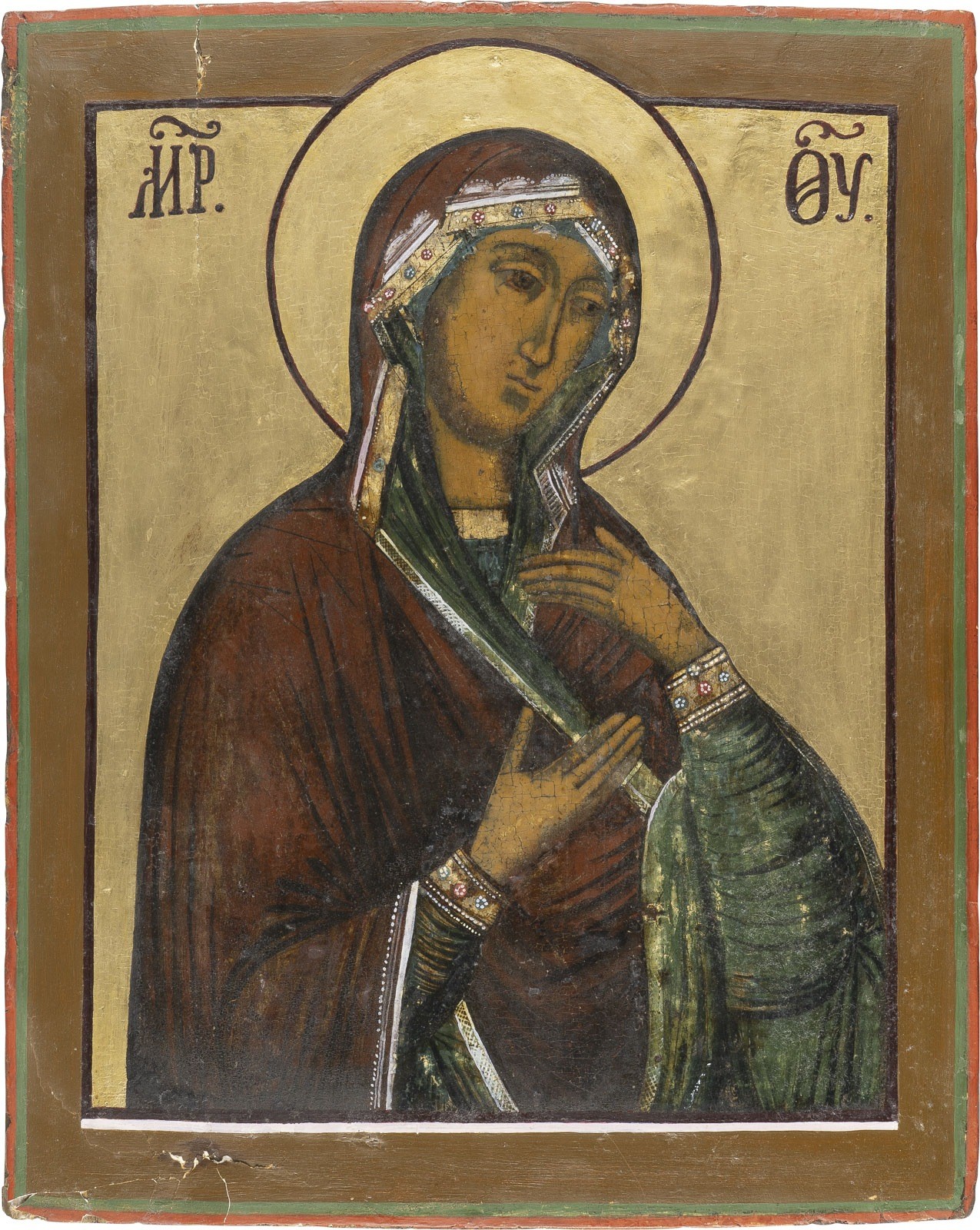 A VERY LARGE AND FINE ICON SHOWING THE MOTHER OF GOD FROM A DEISIS Russian, early 18th century Tempera on wood panel. The background regilded, paint blisterings to the borders, minor vertical crack, partially restored. 51.4 x 41.3 cm.