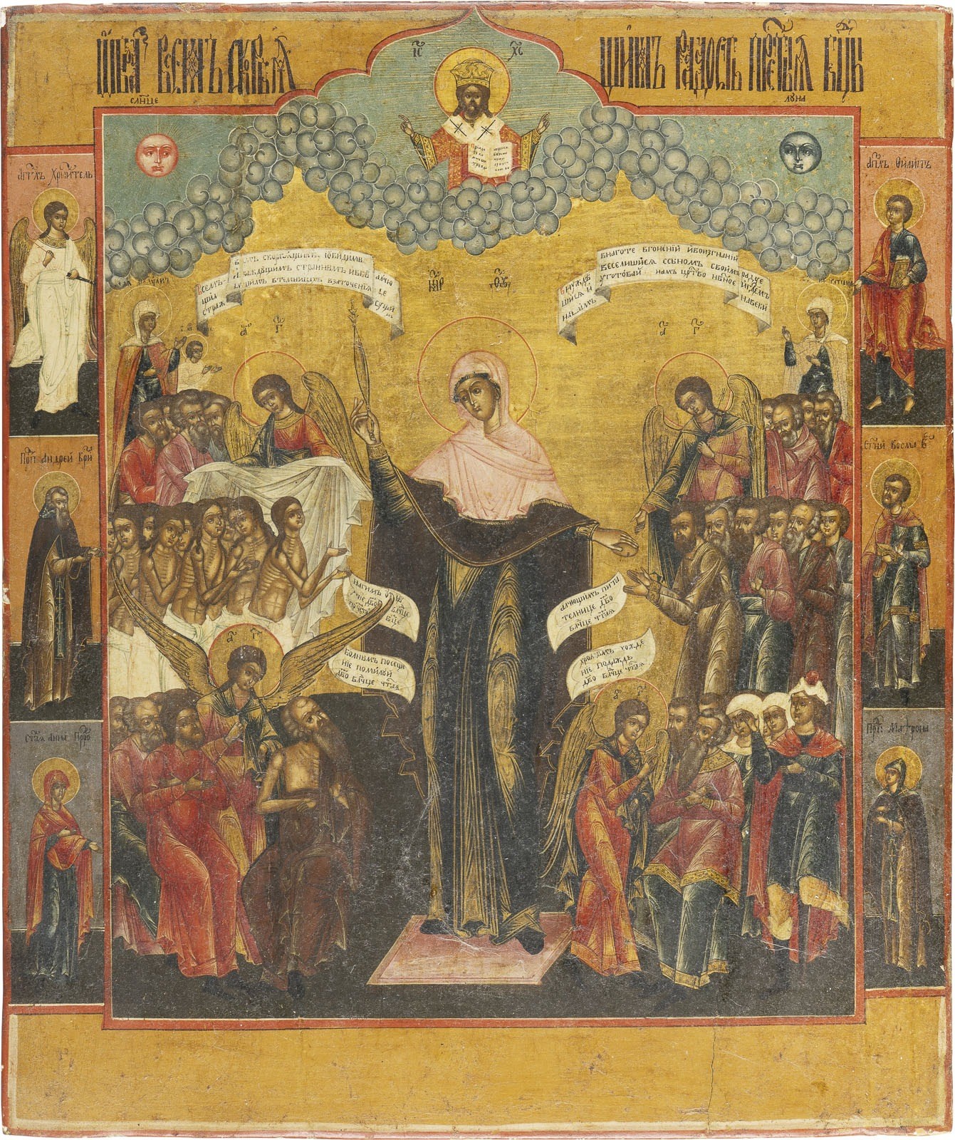 A VERY LARGE AND FINE ICON SHOWING THE MOTHER OF GOD 'JOY TO ALL WHO GRIEVE' Russian, 1st half of the 19th century Tempera on wood panel. Finely executed with great attention to detail and vivid colours on a shimmering gold ground. Three family patron saints depicted on each side, including the Guardian Angel as well as Saints Cosmas and Matrona. Minor vertical cracks minimally restored. 53 x 44.9 cm.