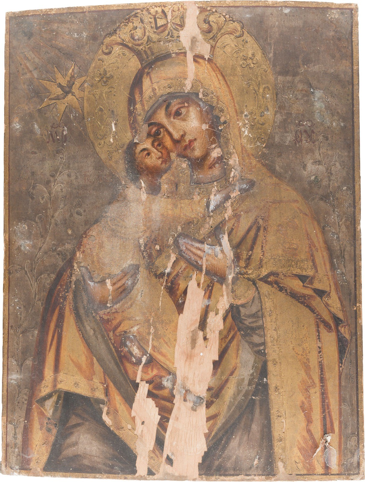 A LARGE AND VERY FINE ICON SHOWING THE VLADIMIRSKAYA MOTHER OF GOD WITH A SILVER-GILT OKLAD Russian, probably Moscow, mid 18th century Oil on wood panel. The silver-gilt oklad richly chased and repoussé with rocailles and flowers. The oklad marked twice '12'. Halo missing, paint losses. 45.8 x 35.5 cm.