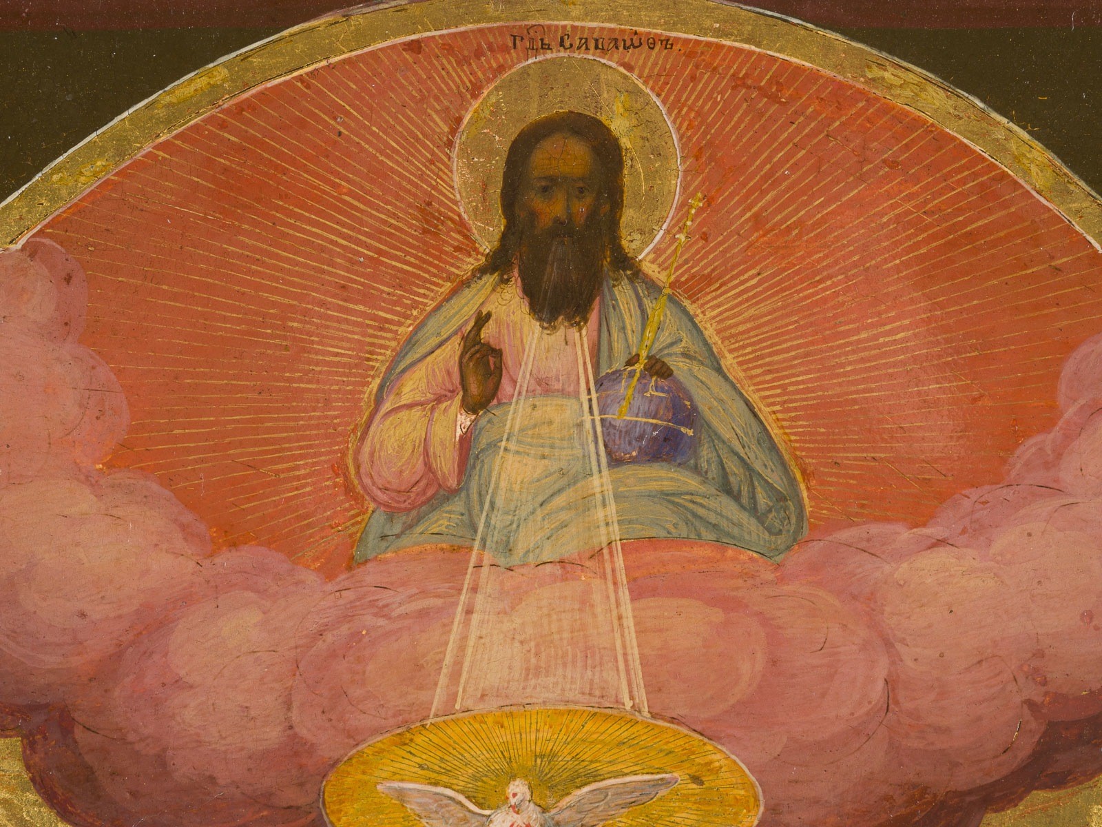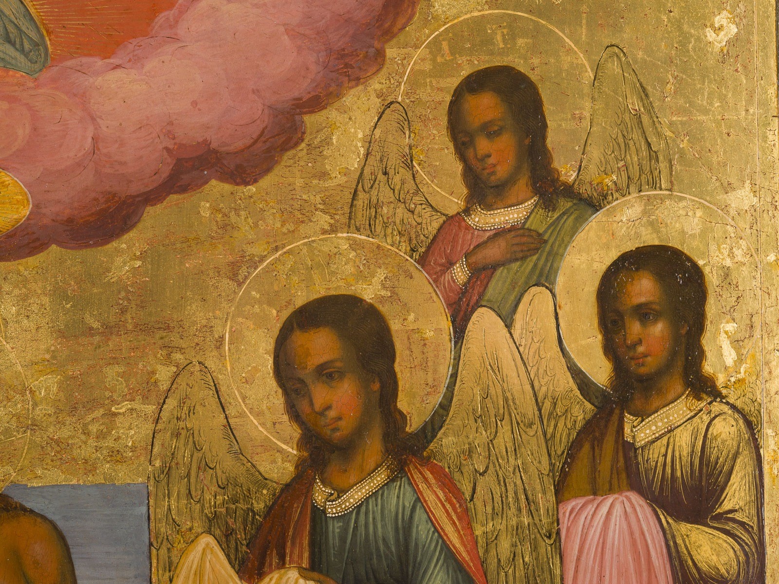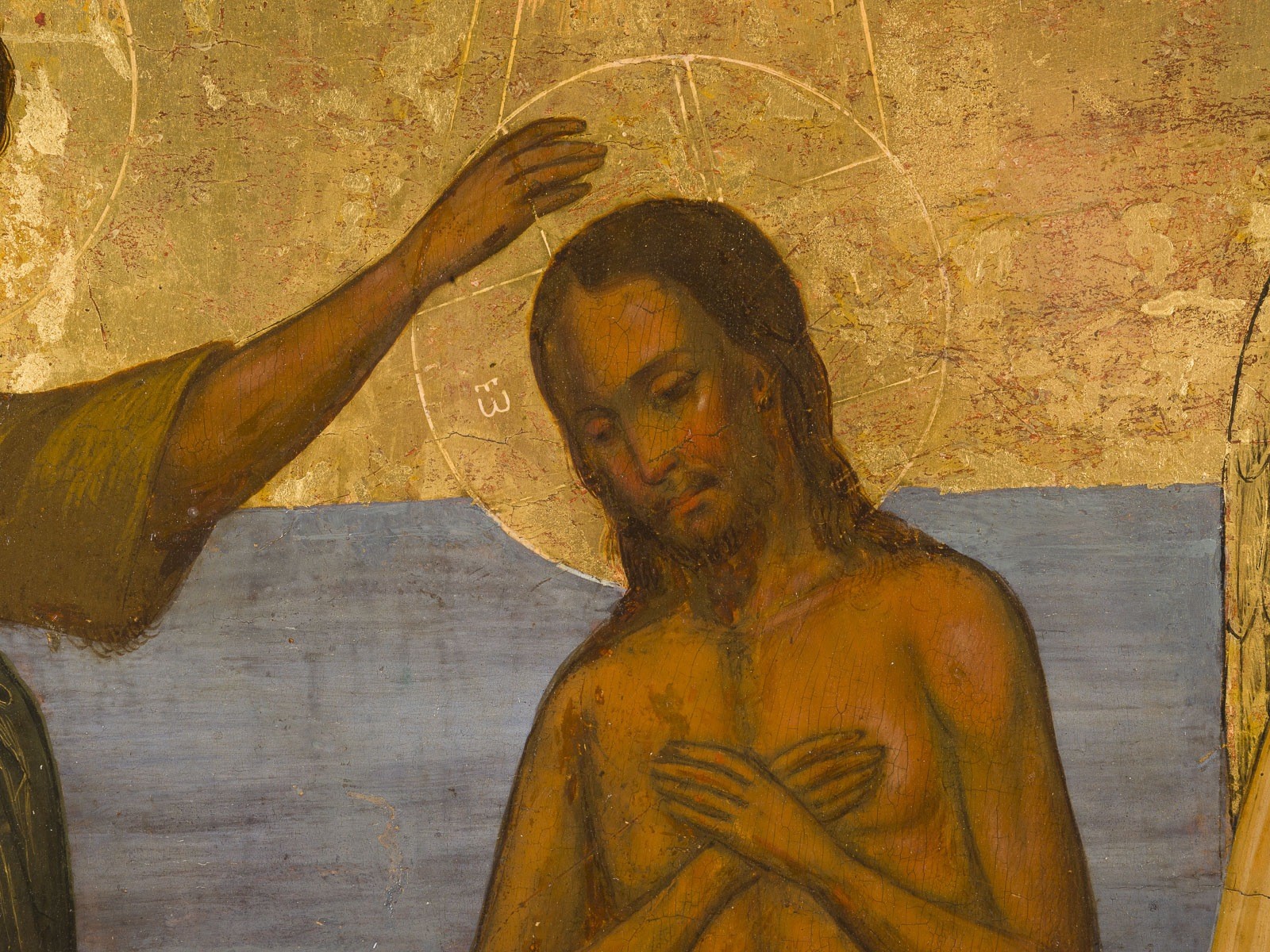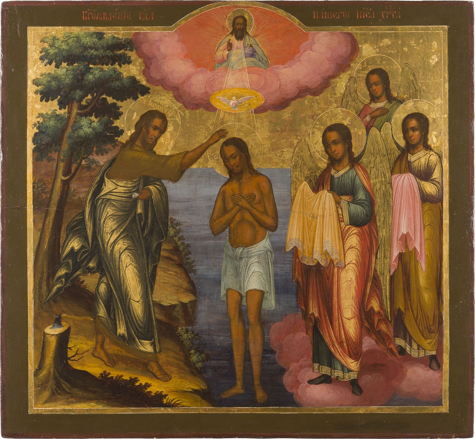 A VERY LARGE AND FINE ICON SHOWING THE BAPTISM OF CHRIST FROM A CHURCH ICONOSTASIS Russian, mid-19th century Tempera on wood panel. The haloes and background made of gold. The garment folds emphasised with strong gold striations. Minor areas of retouching. 52.8 x 57.2 cm.