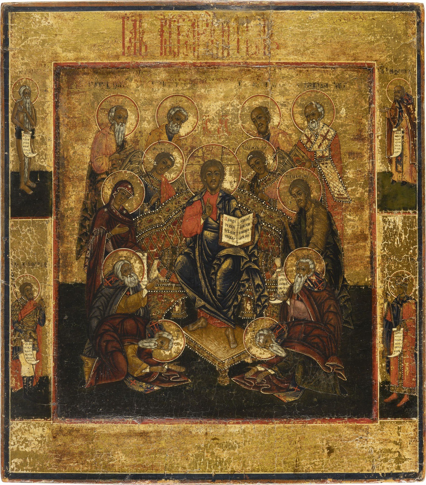 A LARGE AND FINE ICON WITH EXTENDED DEISIS Russian, late 18th century Tempera on wood panel with kovcheg, garment folds highlighted in assist gold. Finely executed in great detail on a gold ground. The throne finely decorated with floral motifs. Two family patrons at each side: a hermit, the warrior saint Eustathios, Niphon, and Catherine. Slightly rubbed. 44 x 39.4 cm. Provenance: Jan Morsink, Amsterdam.