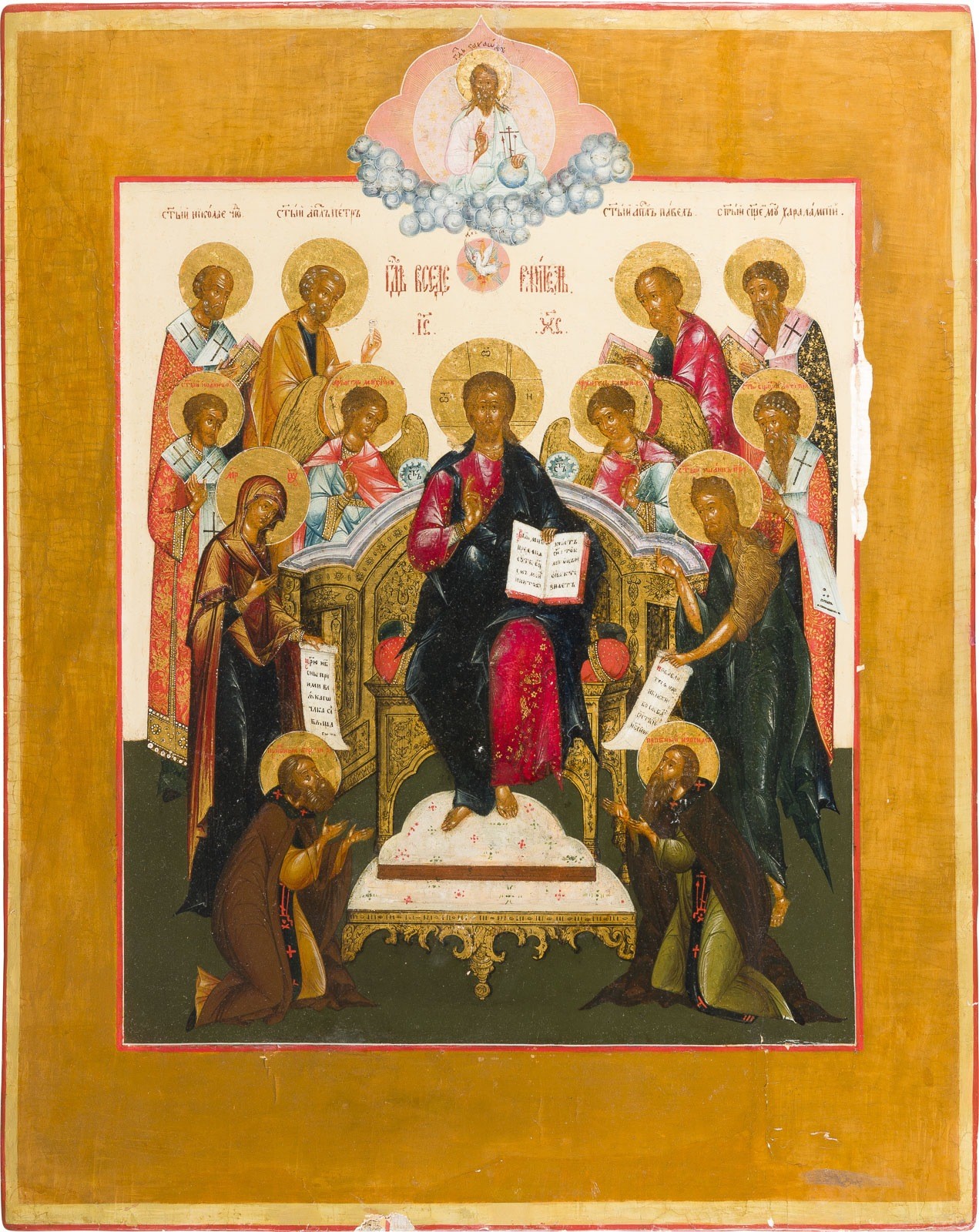 A LARGE AND FINE ICON SHOWING THE EXTENDED DEISIS Russian, Palekh, early 19th century Tempera on wood panel with kovcheg. The haloes made of gold. Minor losses, vertical crack restored, areas of retouching. 53.3 x 43.3 cm.